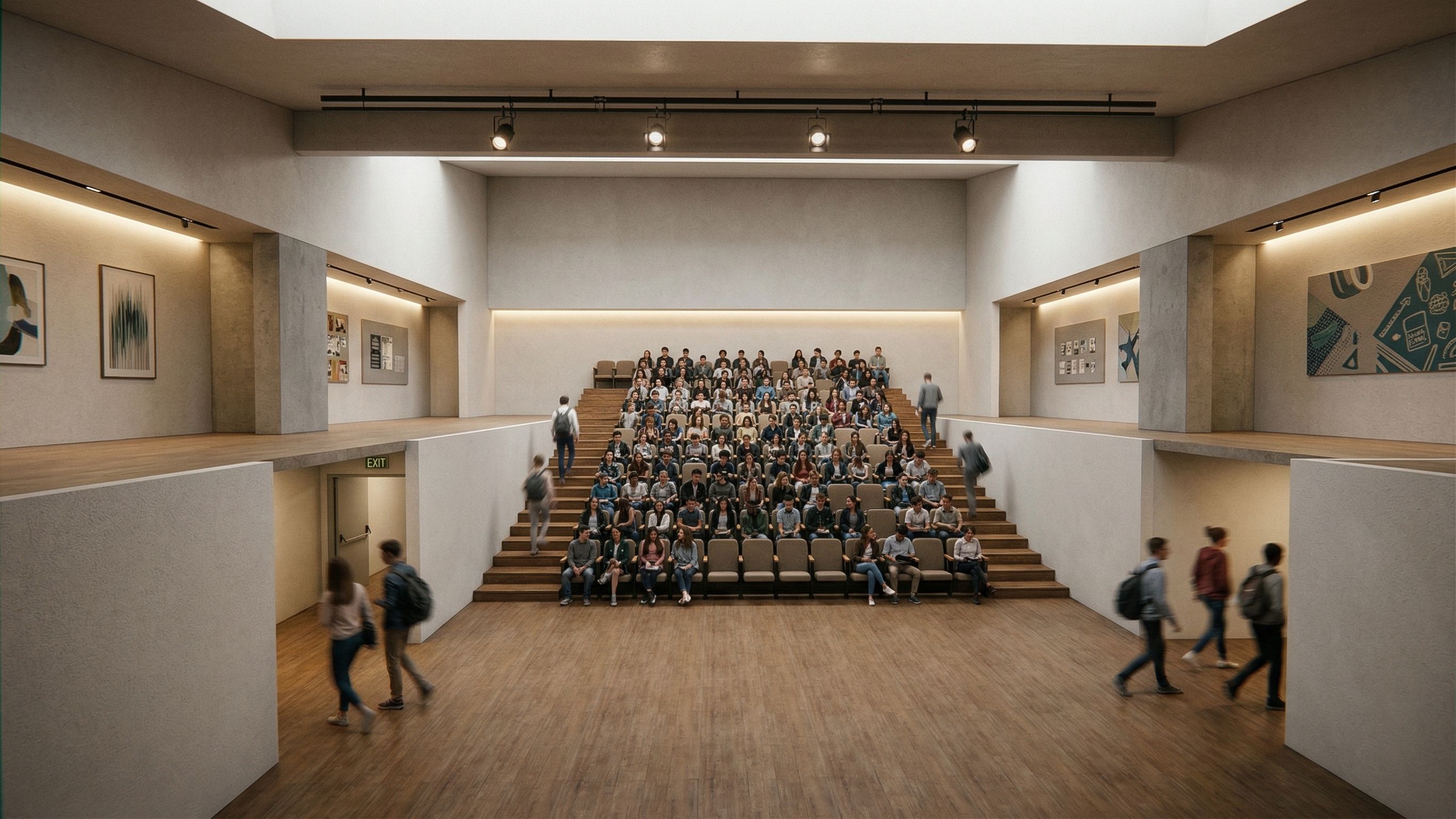 Promptmake this scene a theater with chairs that hold the audience in high school and do simple interior design and make the hall look super realistic