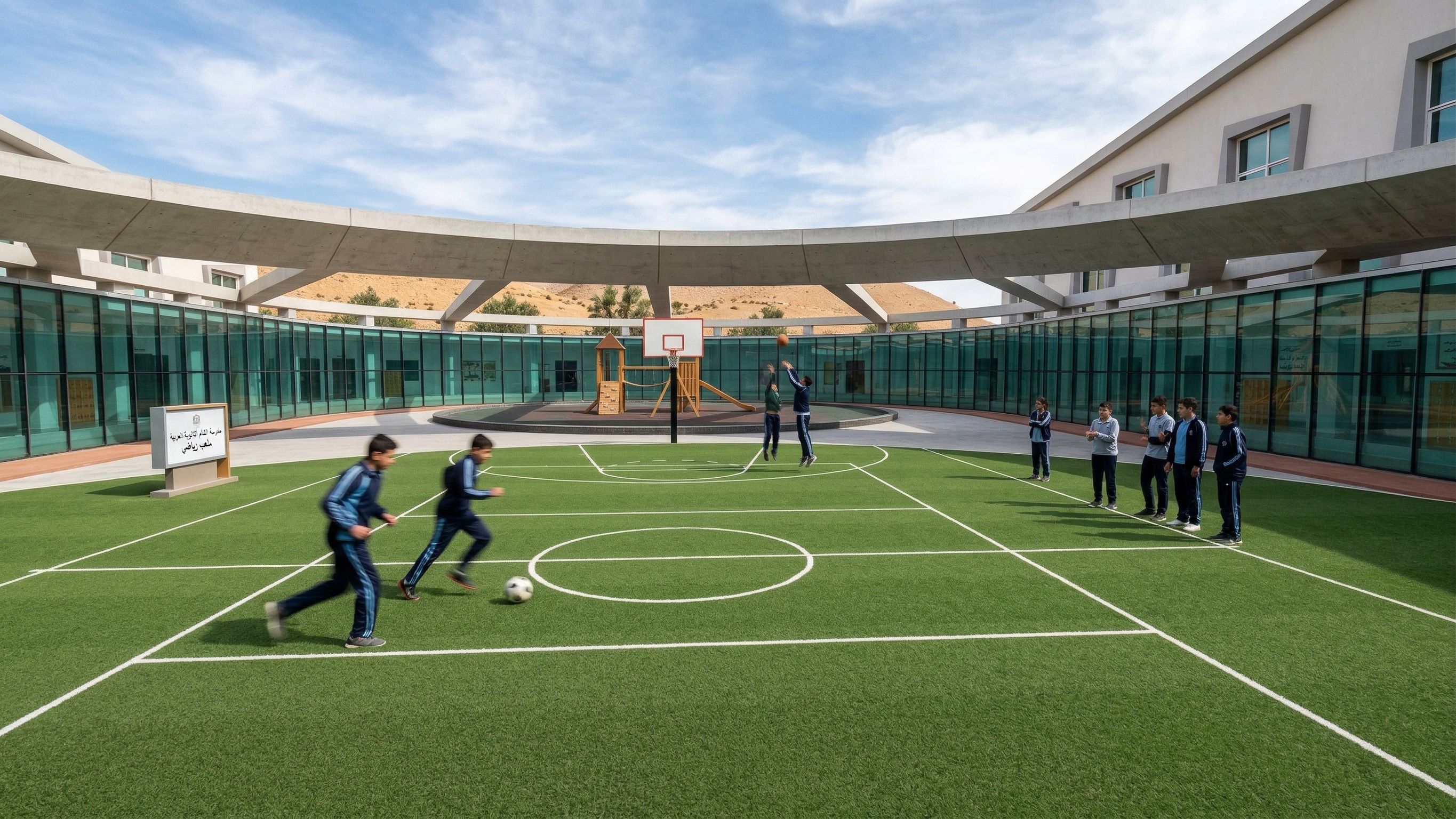 Promptit is the exterior 0f a modern Syrian ARAB high school and it shows the sport court and the playing area ..add students play football and run and enhance the materials and make it clean and well finished and make the scene super realistic.. the outside is a sport court where they play sports, keep exact camera angle, keep exact camera angle