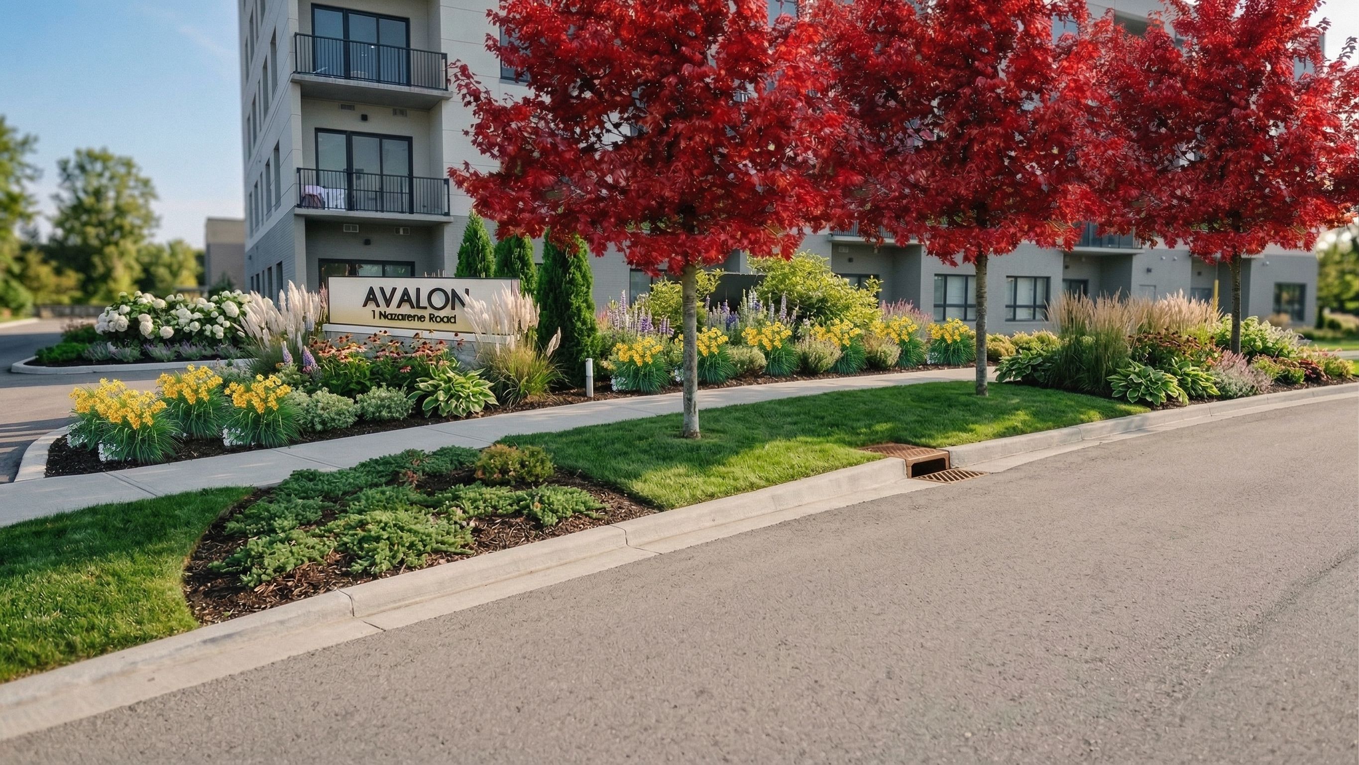 Promptremove the patch of lawn in the foreground - this should be part of the road. take out the mulch and landscaping at hte base of the two maples and just have this be lawn to continue as it is on the far right of the image. keep everything else the same, keep exact camera angle