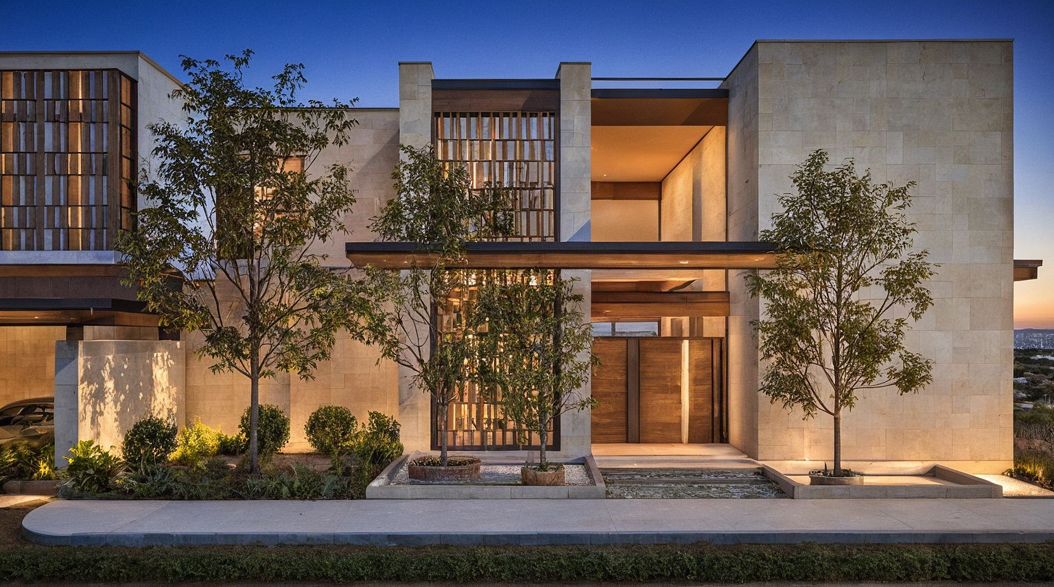PromptModern high-end architecture photo, limestone wall finishes, wooden lattice, horizontal black steel elements, warm lighting, Tintex glass, abundant landscaping, and access with water features.