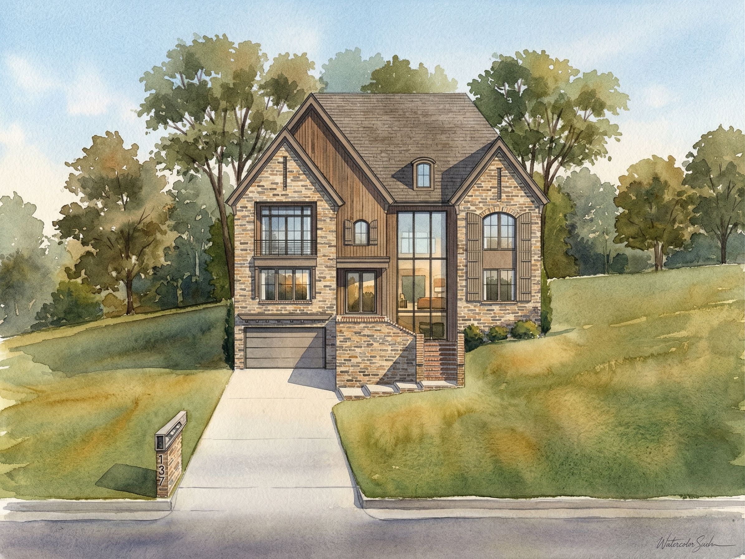 PromptPhoto of a contemporary residential house, featuring a mix of brick and glass materials, with distinct architectural angles and large windows that create a modern aesthetic. The setting is suburban, surrounded by lush trees and a gentle slope. Bright morning light casts soft shadows across the facade, highlighting the textures of the exterior. Captured from a slight low angle, the lens emphasizes the house's height and design complexity, presenting a dynamic perspective of the entrance and driveway., keep exact camera angle