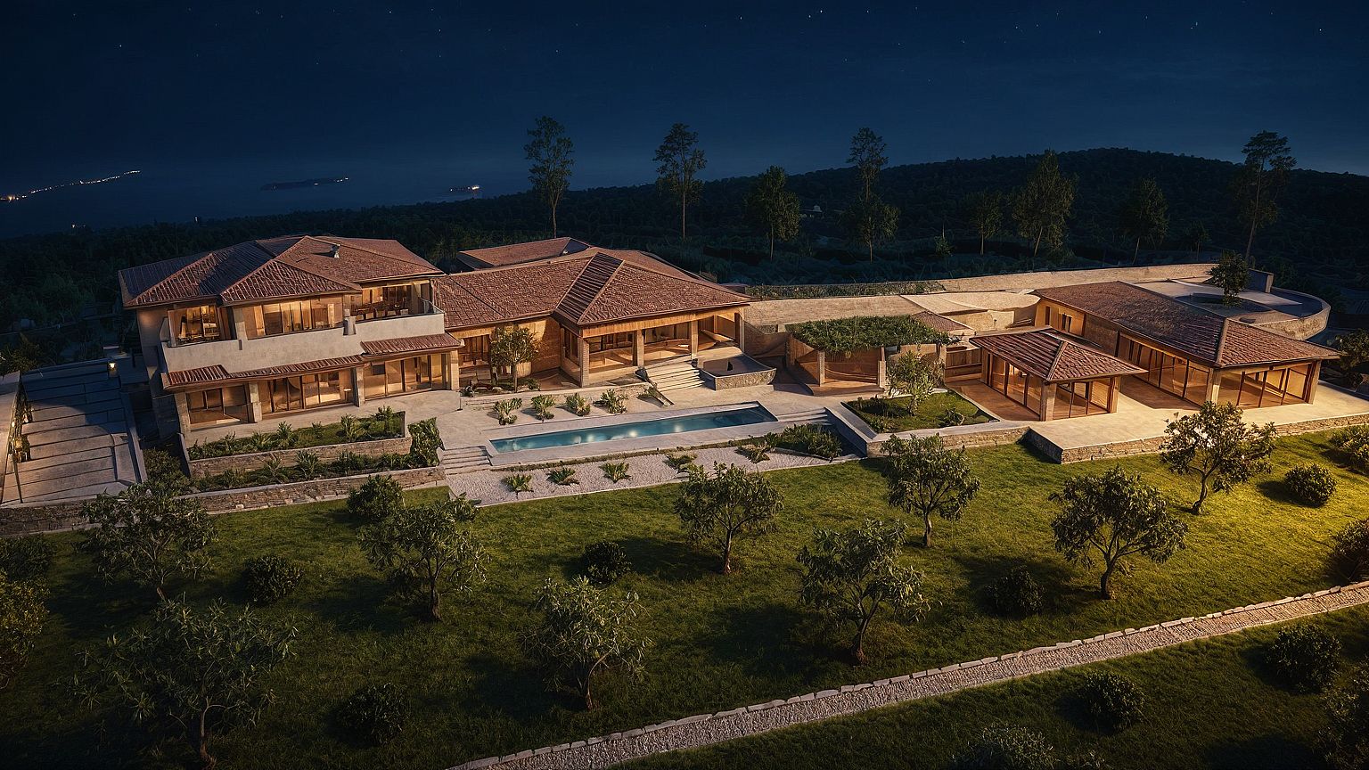 night scene with warm illumination from the interior