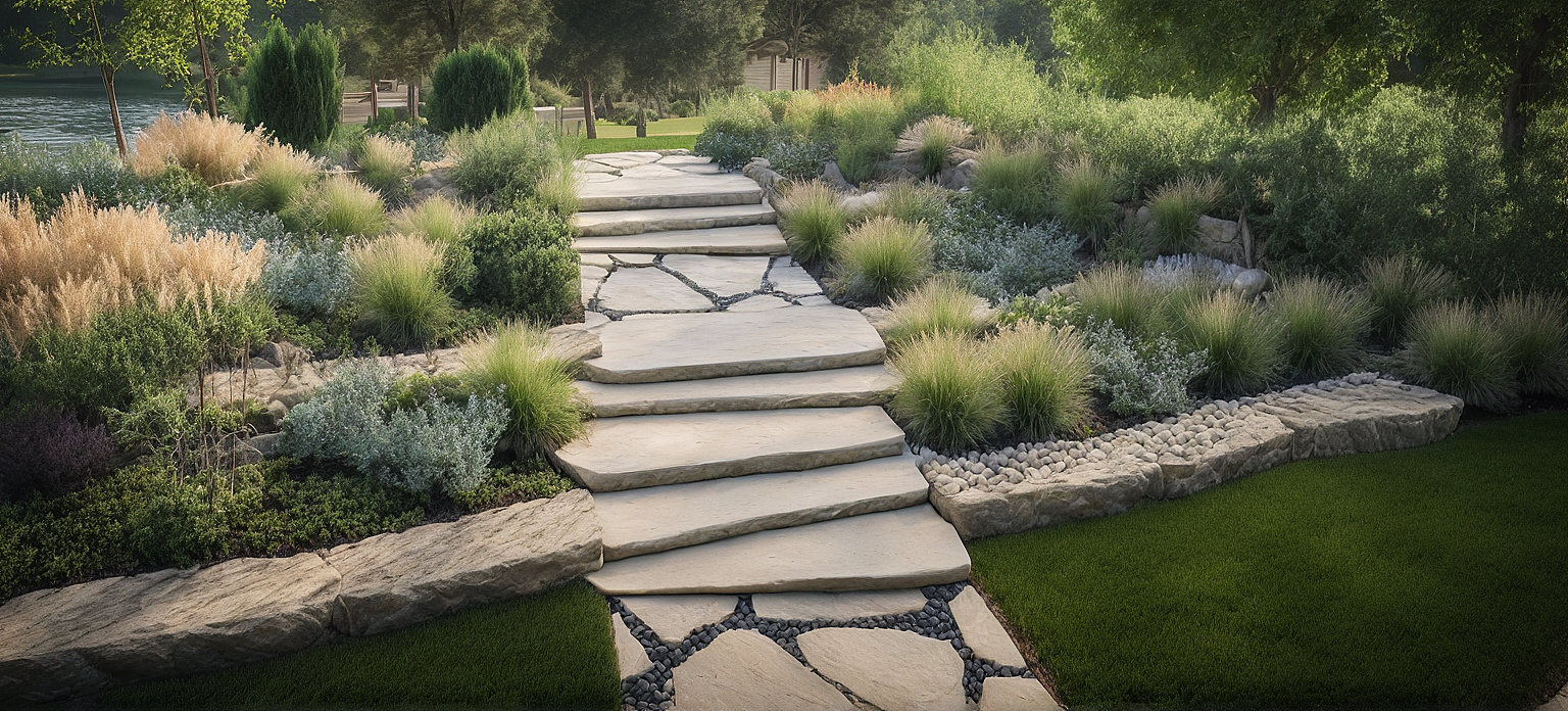 turf lawn, limestone retaining wall, perennial grasses, juniper trees, Russian sage, hydrangea, river birch, dry bed, boxwoods
