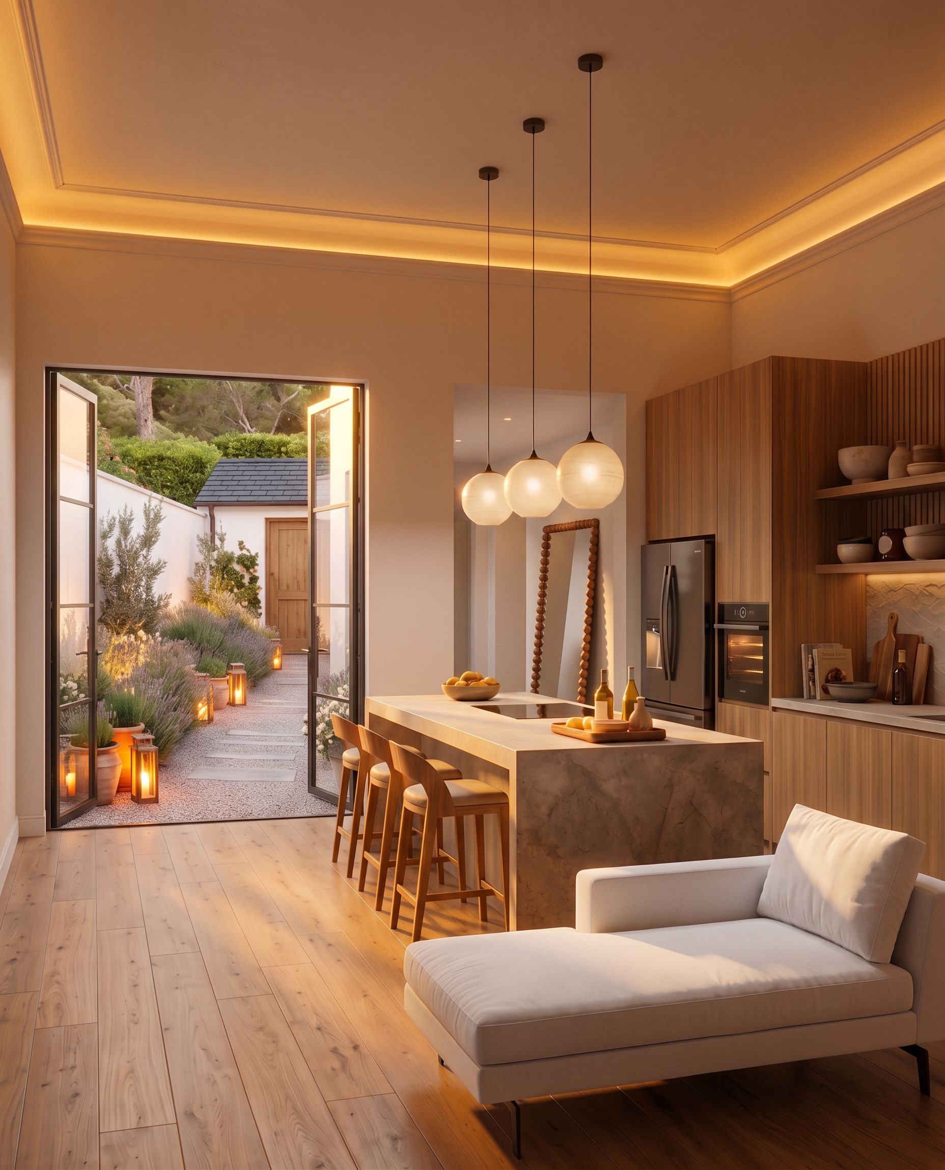 Promptretirar objectos da chaise lounge. mudar a cor da chaise lounge para brancoretirar os moveis do corredor e colocar um espelho conforme referência. aumentar em alturao muro do jardim. retirar cahminé e cocolcar telha cinza muito escura , keep exact camera angle