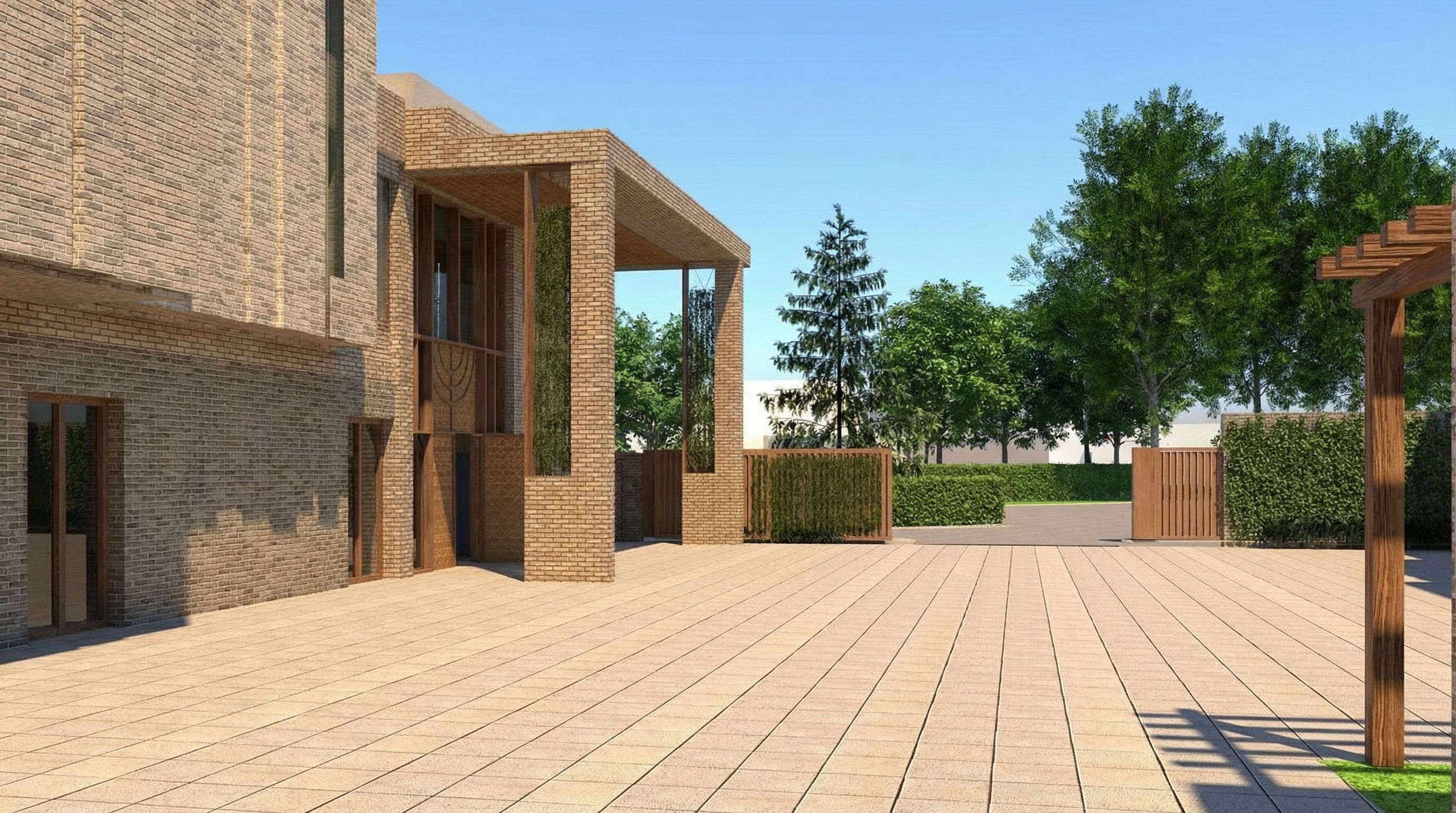 architectural exterior rendering, render this 3D mass into photorealistic rendering, new synagogue, emphasize brick detailling, midday light , eye level view, high quality, professional, detailed scene