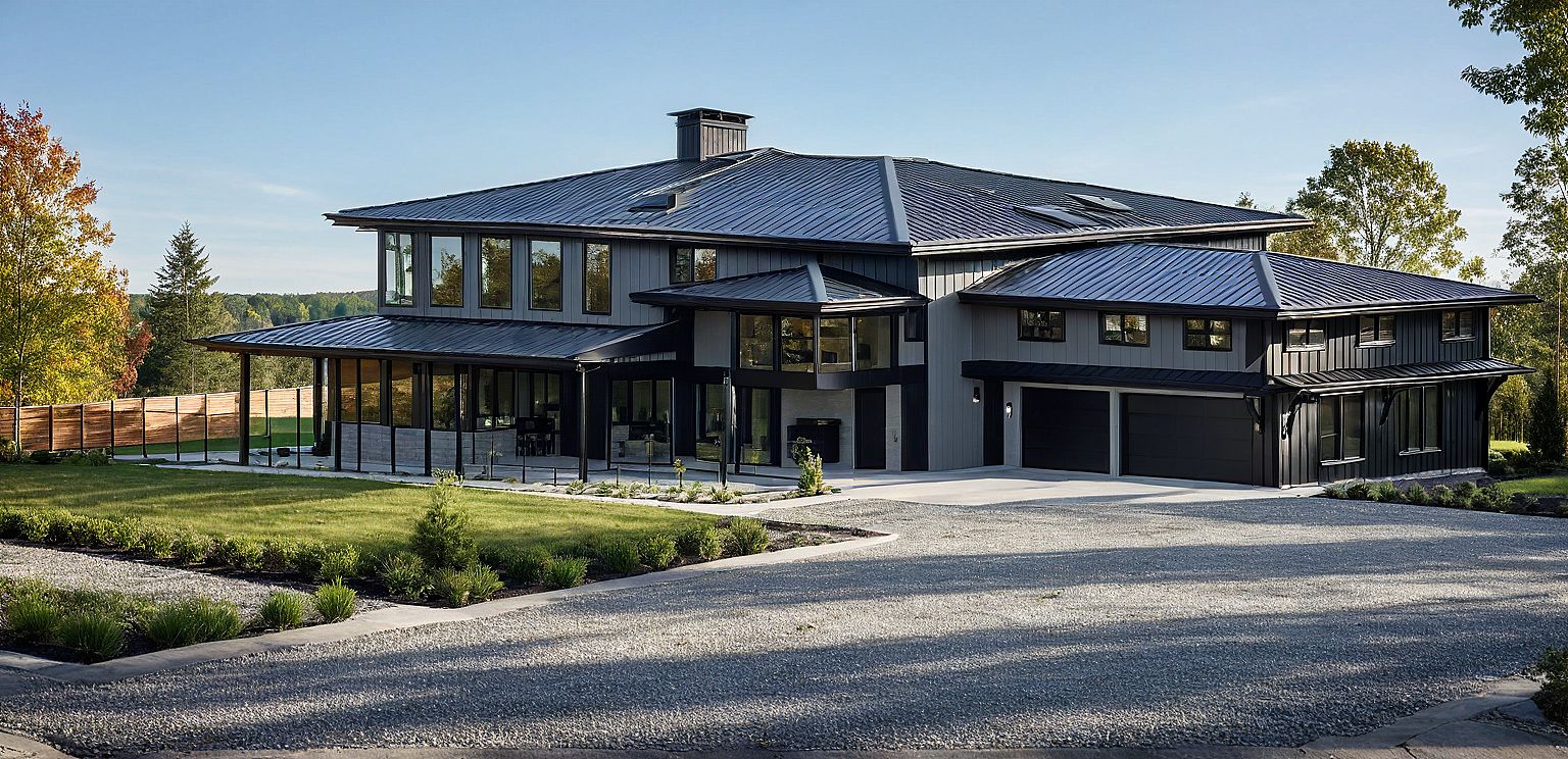 PromptRoof is standing seam black, Siding is light grey vertical board and baton, window and door trim is black, sunny day with light reflected in the windows, garage and foyer face a paved driveway with landscaping around it, interior lights are visible