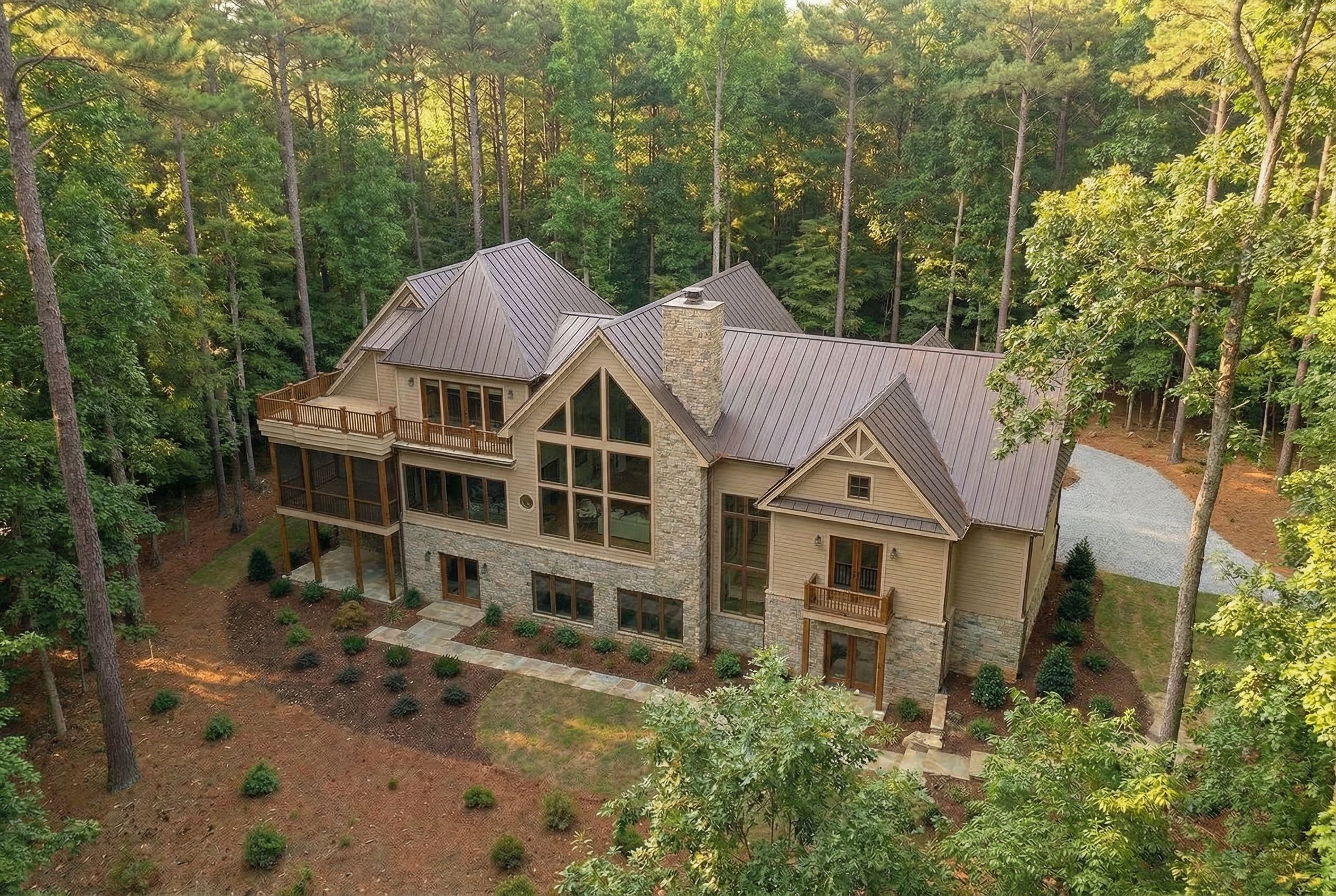 Promptarchitectural exterior rendering, render this 3D mass into photorealistic rendering, create an elevation of the side based on the reference rear elevation , aerial view from above, high quality, professional, detailed scene