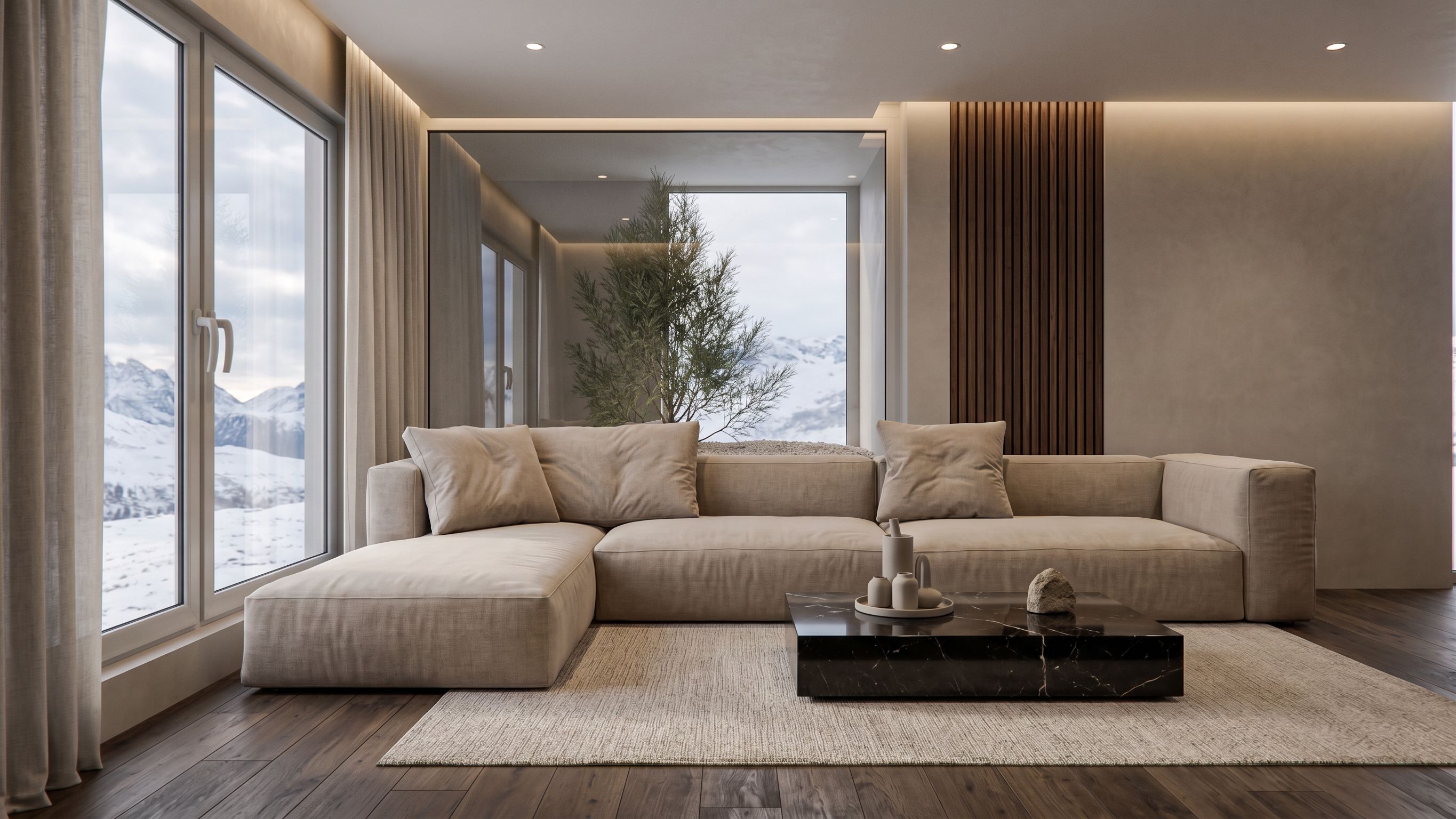 Ultra-realistic modern luxury living room, minimalist warm interior with strong contrast, natural materials, calm atmosphere.