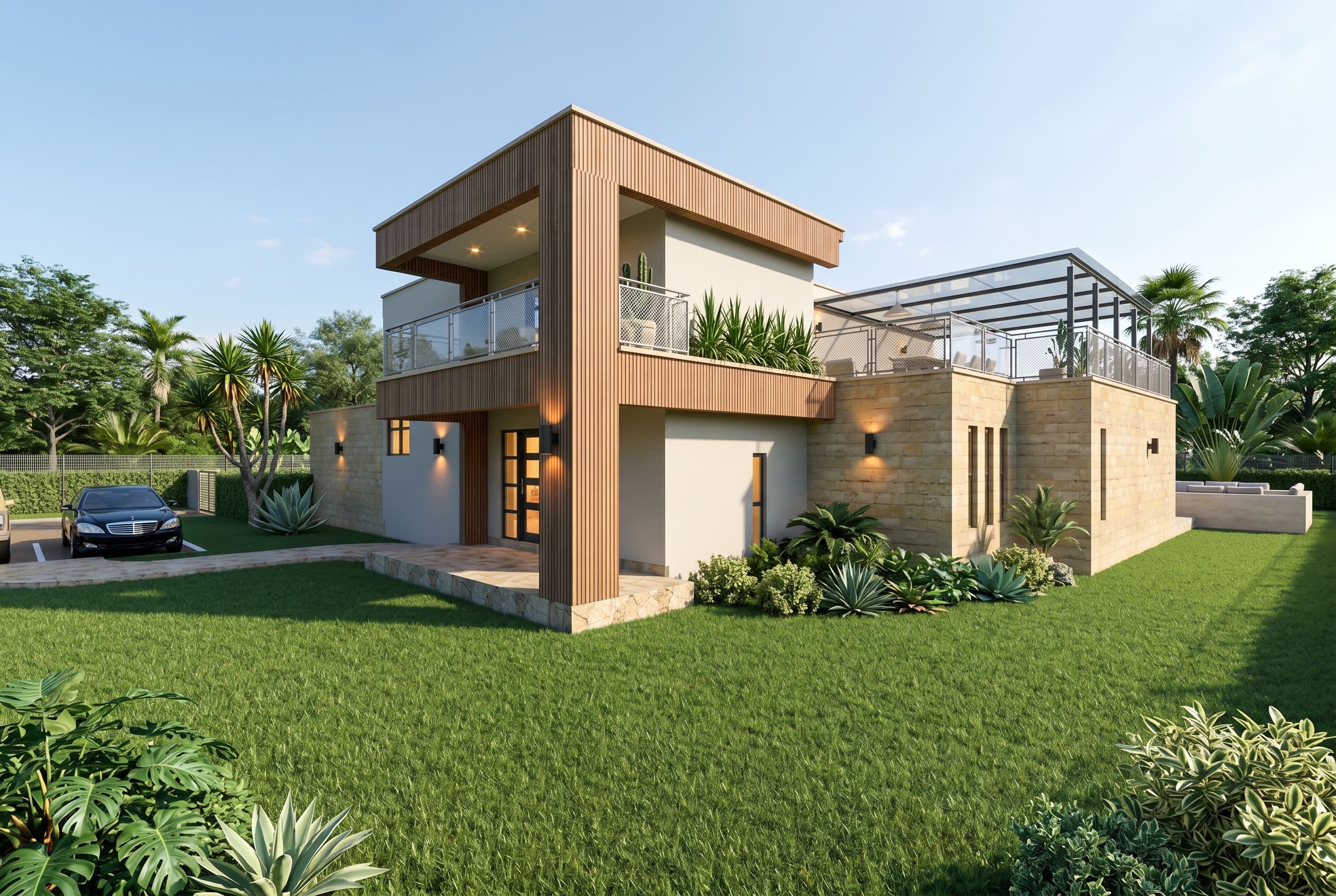 Create a daytime, photorealistic exterior architectural render based on the attached reference image. A contemporary two-story residence features a striking exterior with vertical wood slat cladding and yellow stone masonry on the ground floor. The building includes a spacious second-floor balcony with metal mesh railings and a large rooftop terrace sheltered by a modern glass pergola. Natural daylight fills the scene under a clear sky, with realistic sun direction casting soft, accurate shadows across walls, paving, and landscaping. Exterior wall lights and balcony soffit downlights are switched on, emitting a warm glow that contrasts subtly with the daylight, while interior lighting is faintly visible through the glazing for depth. Enhance the landscaping with lush green bushes and low shrubs placed around the footprint, complemented by neatly maintained lawn areas and a few taller ornamental plants near boundary mesh fence and live in the background. Vegetation should feel tropical, balanced, and well-scaled, with gentle leaf shadows adding realism. All materials should display high-resolution textures and subtle imperfections, with realistic glass reflections and accurate global illumination. The overall mood is calm, refined, and premium, suitable for high-end residential marketing, with no people visible and a clean, magazine-quality finish. Turn on interior lights and the two-way exterior wall lights. Keep the exact camera angle., keep exact camera angle