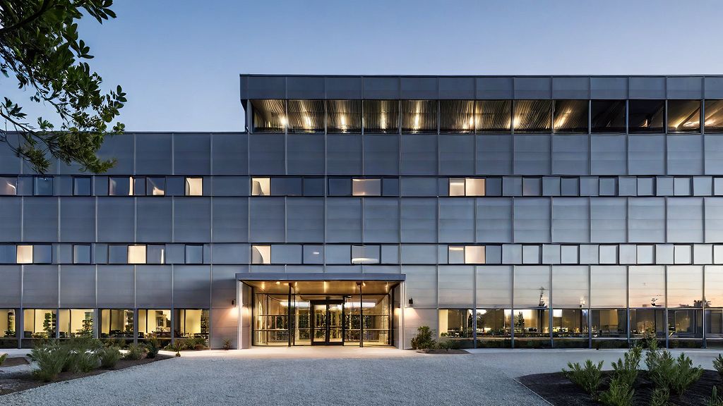 PromptPhoto of an industrial facility, showcasing a modern design with sleek lines and small glass windows. The exterior features a combination of textured gray panels and reflective surfaces, highlighting its contemporary architecture. Surrounded by open landscaping with sparse vegetation and a gravel path, the setting includes nearby industrial elements in the distance. Bright daylight casts soft shadows across the facade, enhancing the building's details. Captured from a low angle to emphasize the height and imposing structure, with a wide lens to include the environment.