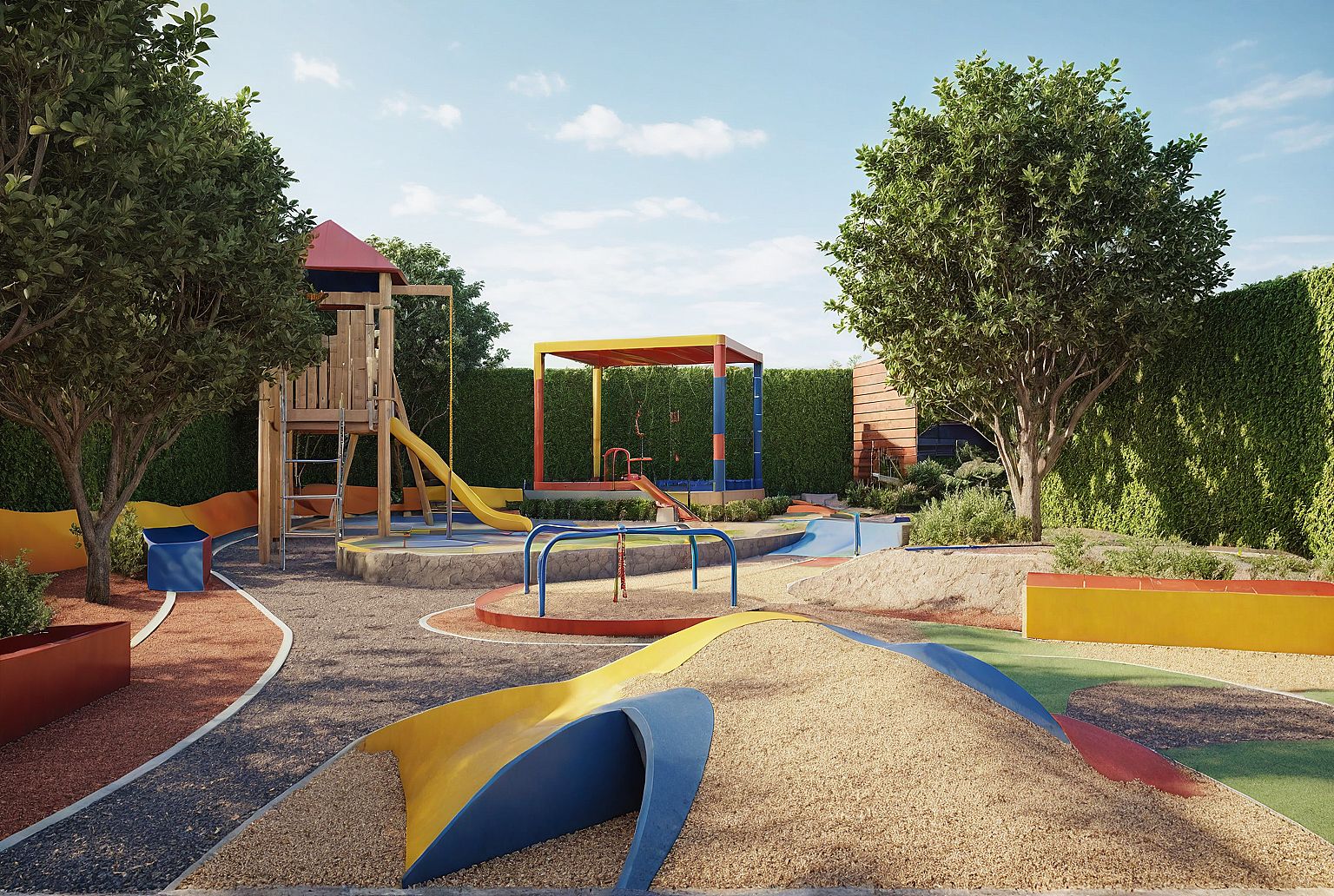 A realistic depiction of a children’s playground, showing all original shapes, colors, and textures. Natural daylight,