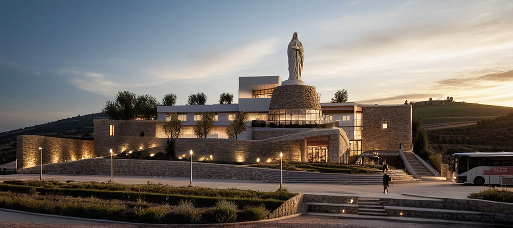 Prompt12 meter Hight sculpture on top of a circular building with stairs around it , holy atmosphere , sunset , olive fields on the side of the hills, add a lot of tourists and nuns to the render, old stone cladding ' cars on the road ,dim warm lights from inside the buildings, bus station near the street , don't change the building geometry and shape