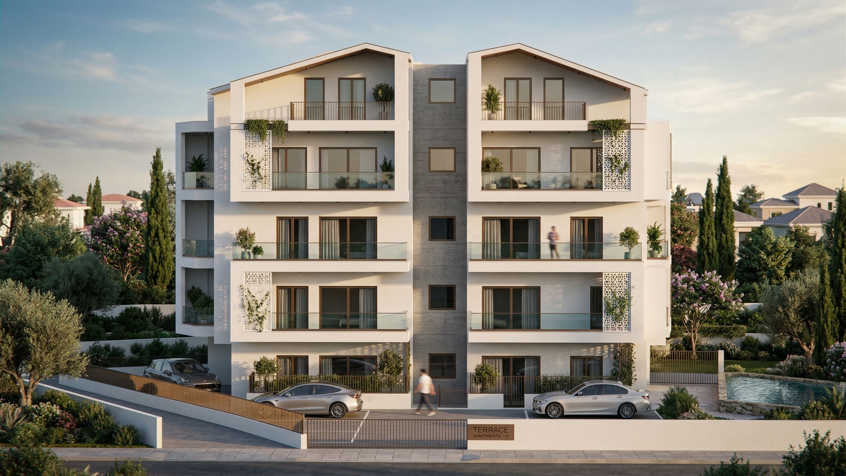 PromptModern block with large bronze alumil windows, materials such as concrete,plaster,metal, white clauster surrounded with greenery. This is the back of the building.!! Put parking at the front inside the fence and also put 3 cars in front of the building., keep exact camera angle