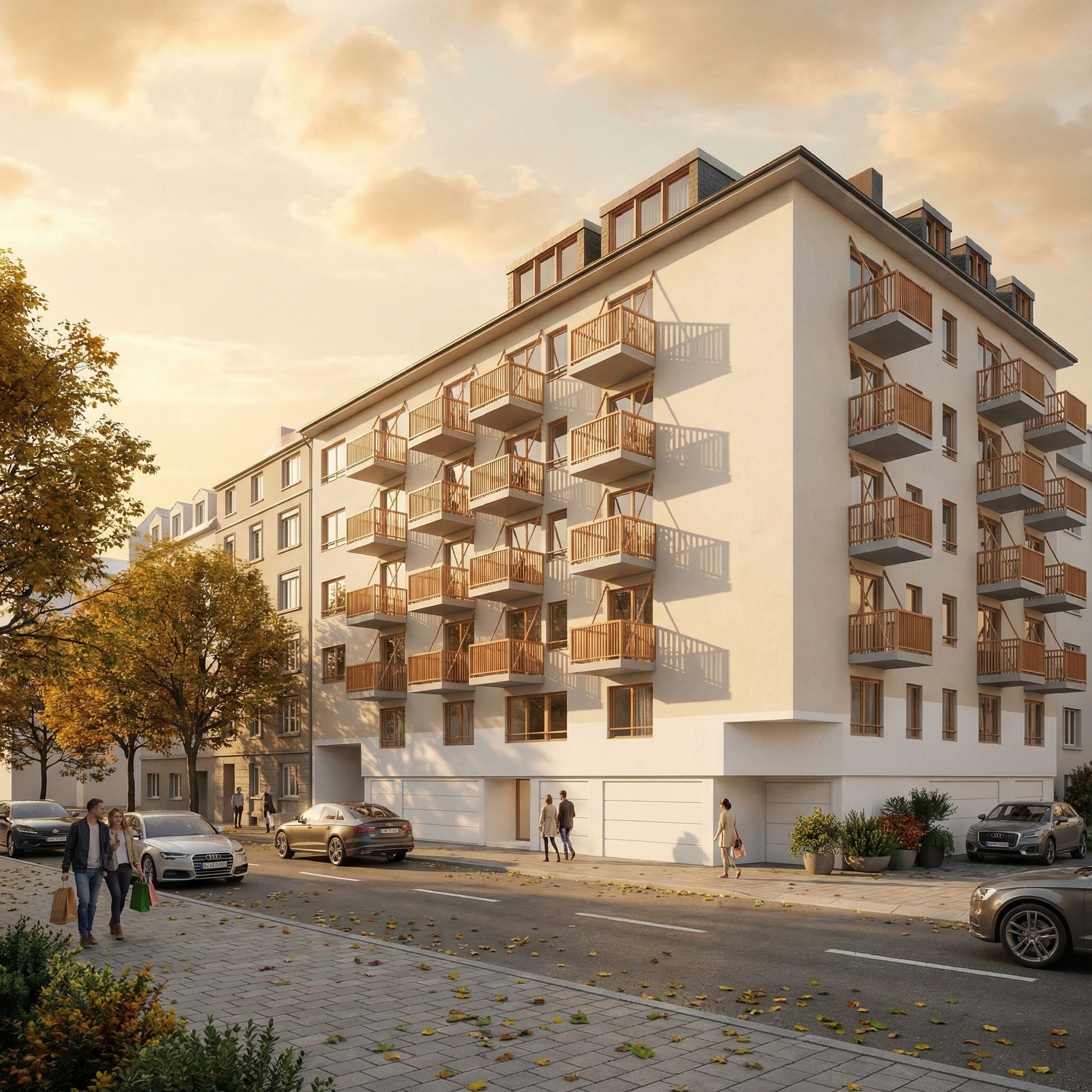 architectural exterior rendering, render this 3D mass into photorealistic rendering, Photorealistic modern sleek residential building located in Zurich, the building stands on an urban paved surrounded by a mid width street with a few realistic trees on the other side of the street, with a warm early autumn atmosphere, warm sunlight, mix of yellow and green dry leaves on the ground, featuring very light beige plaster walls, the first level has white plaster walls, keep exact camera angle, golden hour warm lighting, including people, vehicles, greenery and vegetation, trees, high quality, professional, detailed scene