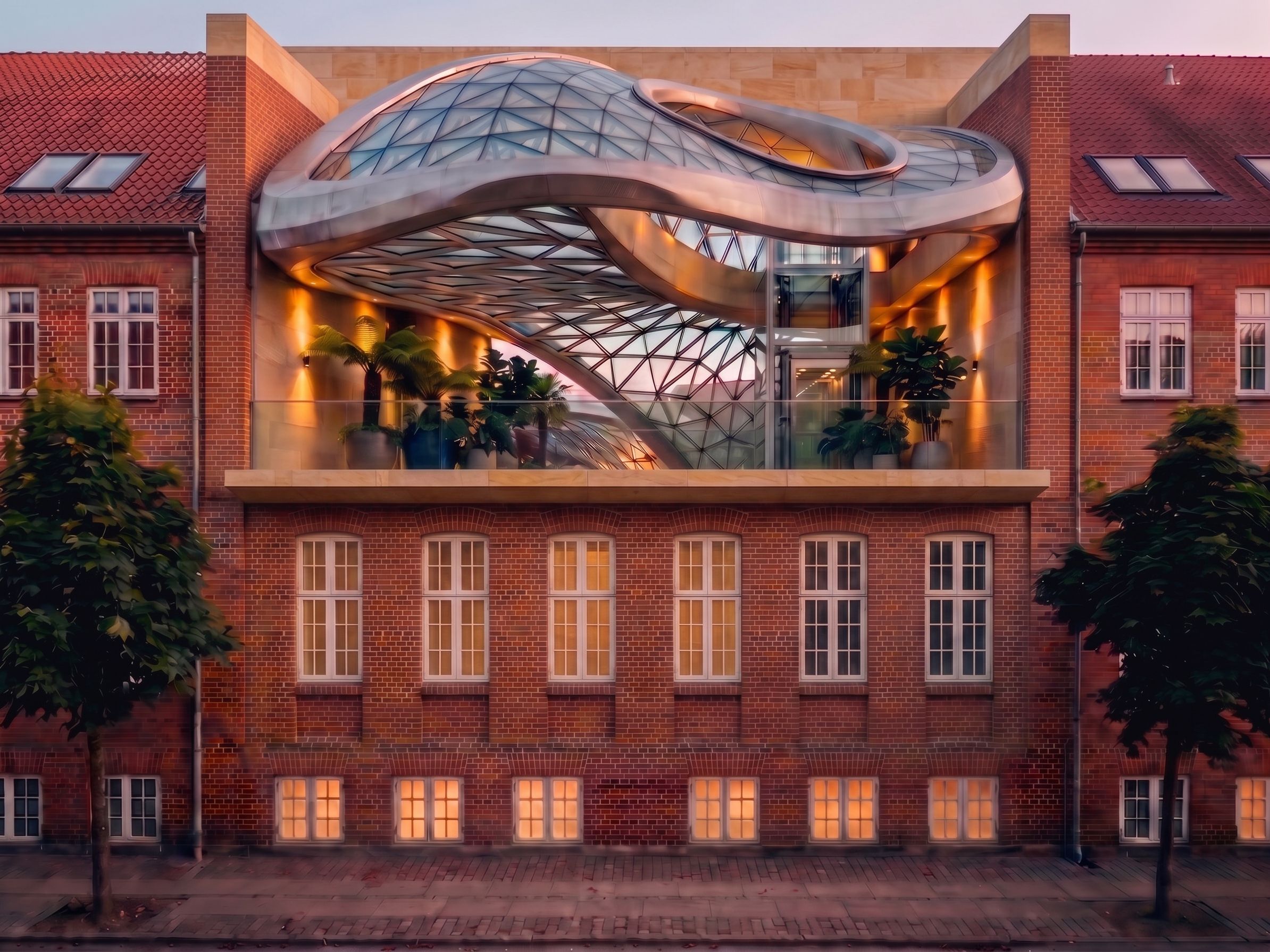 PromptEdit this image. Align the six tall windows on the first floor with the six low windows on the ground floor. Create a sand-colored stone ceiling, projecting 50 cm below the glass parapet and 50 cm wide. The two walls to the right and left of the ergonomic glass roof are as high as the ridge of the red tiled roof, and above them are a horizontal wall, 50 cm thick, made of sand-colored stone., keep exact camera angle