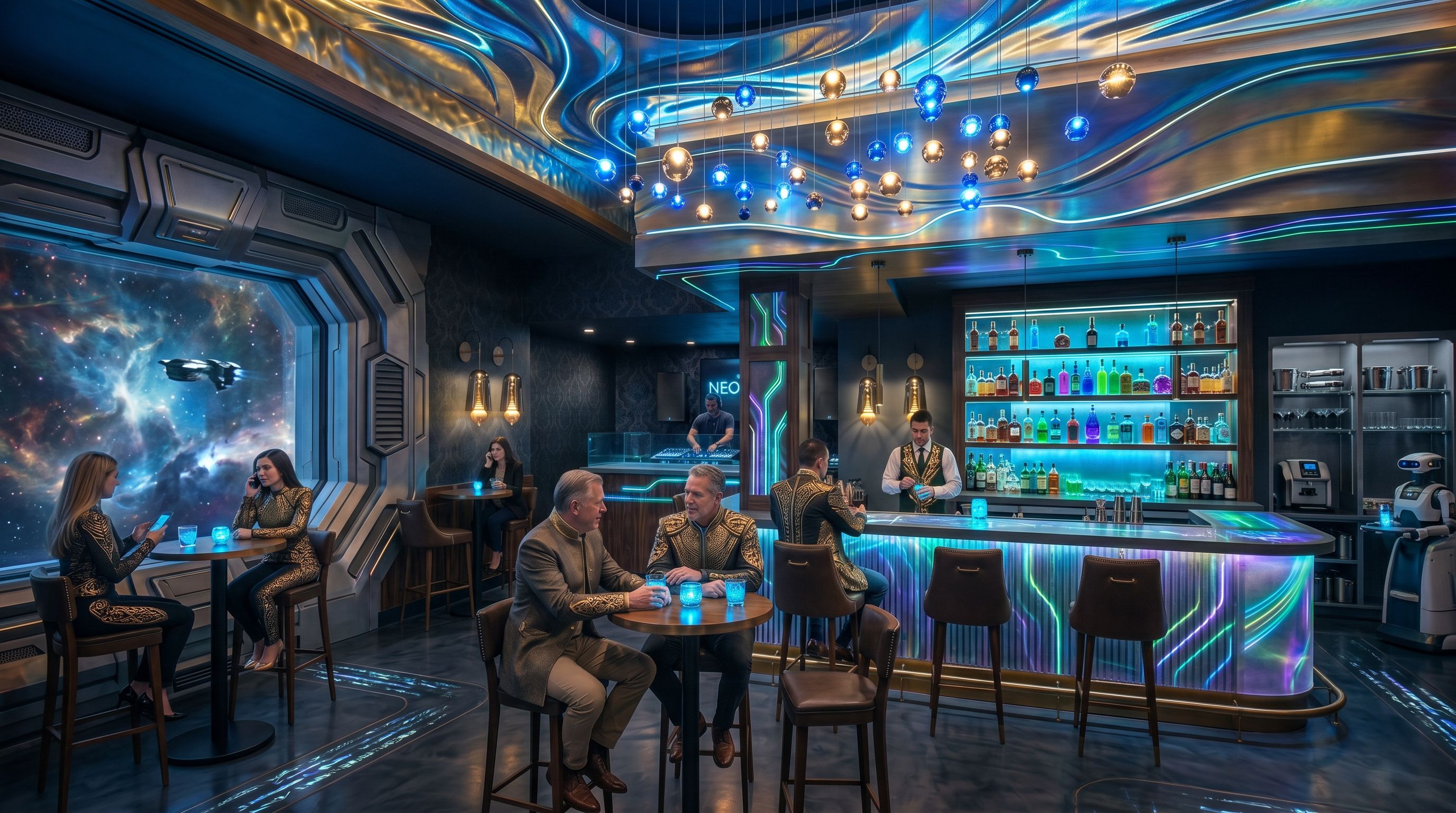 Mantén la arquitectura general de la imagen, el mismo tipo de taburetes, las mismas personas y mantén el formato apaisado de imagen, en horizontal de ancho por alto y haz los siguientes cambios: Crea un estilo ultra futurista, con un decorado totalmente rompedor, como de películas de naves espaciales, con bebidas azul eléctrico y colores fluorescentes, con personas vestidas con ropas muy elegantes con detalles metálicos dorados como en la película Acquaman., keep exact camera angle
