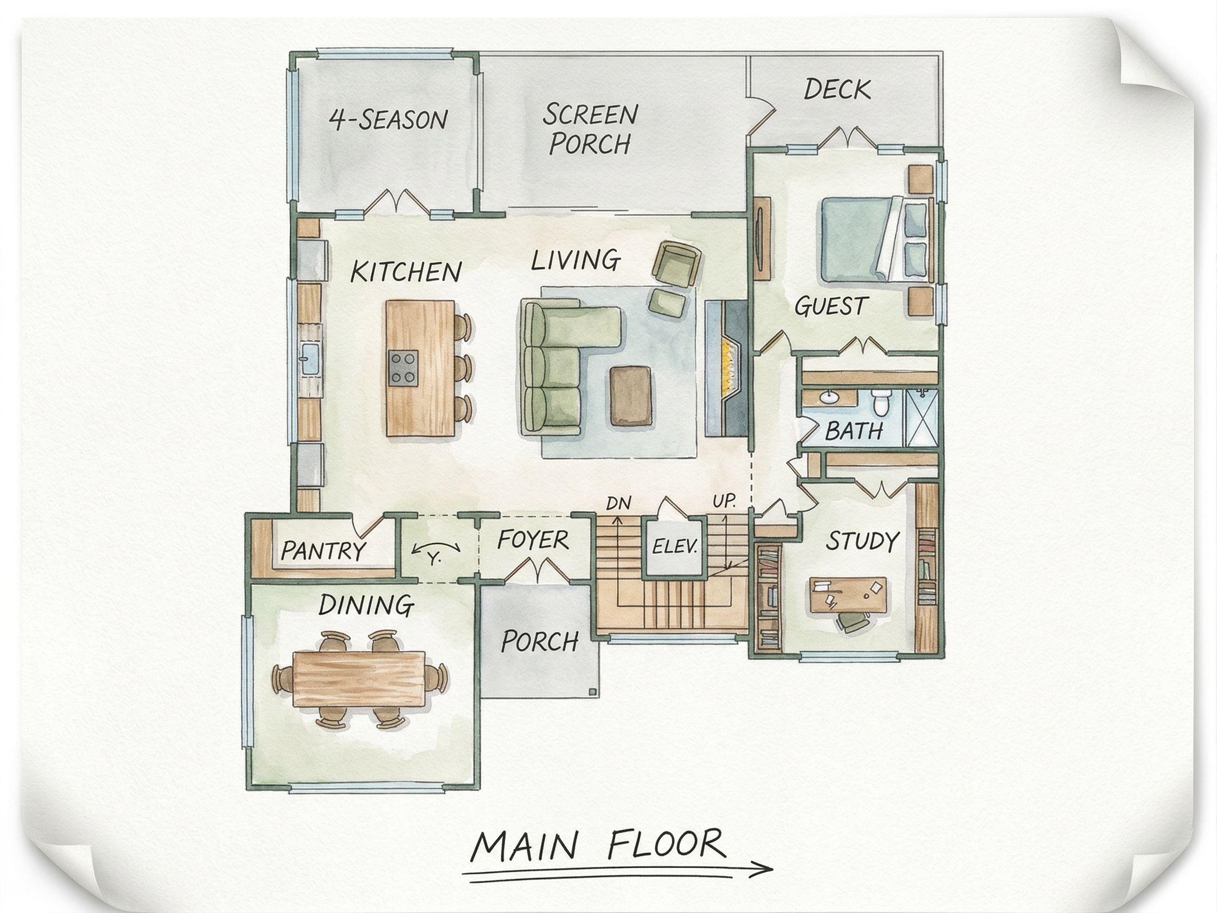 PromptRender this as a marketing plan. linear fireplace in living room. Remove people. Remove stairs from screen porch. keep desk in study add bookshelf in nook of study., keep exact camera angle