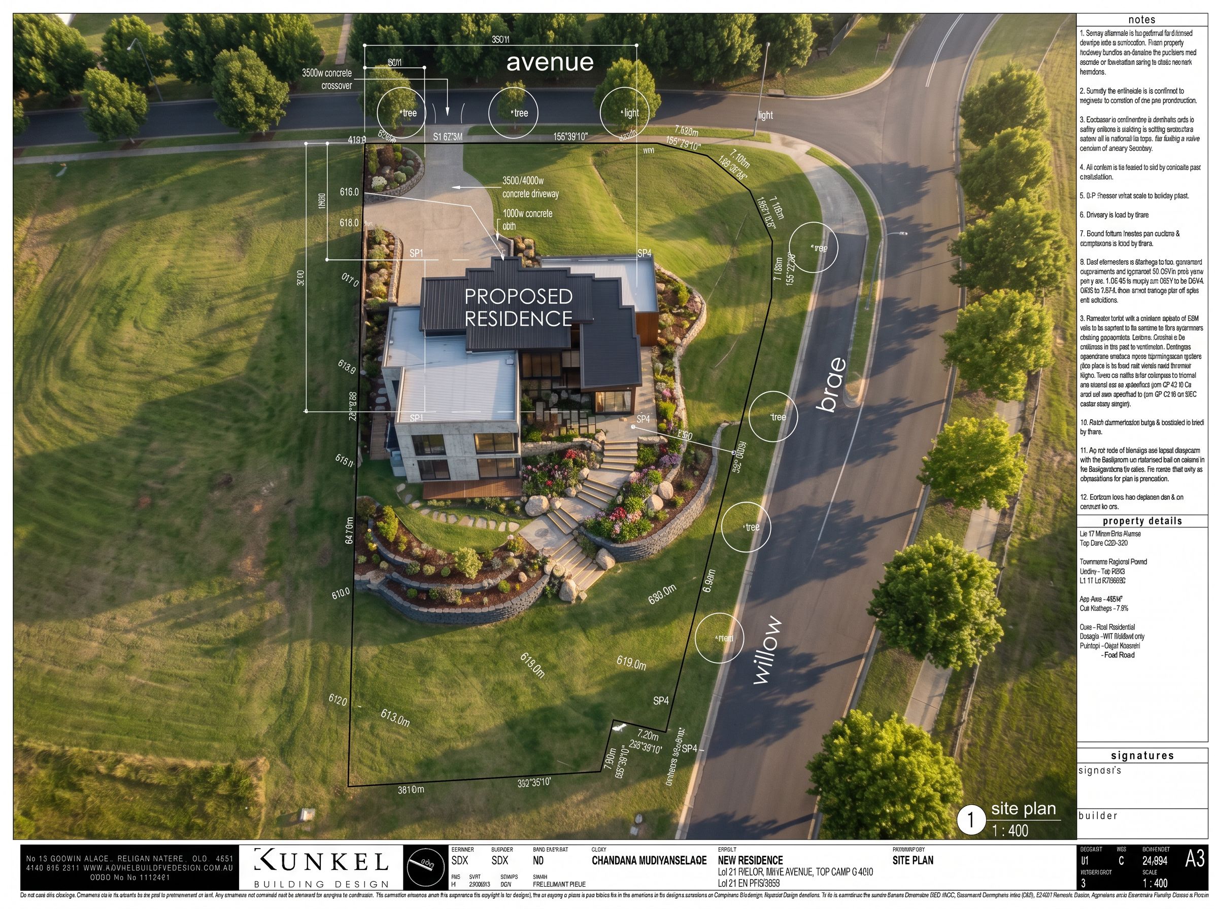 PromptPhoto of a proposed residential building site, showcasing a carefully planned layout with adjacent tree-lined avenues. Features include a multi-level structure designed to harmonize with the natural terrain. Elements consist of a concrete driveway and paths leading to the entrance, integrated landscaping, and surrounding architectural context. Daylight illuminates the site, casting soft shadows across the contours. A wide-angle lens perspective emphasizes the building's relationship to its environment, highlighting the interplay of light and shadow in this tranquil residential setting.