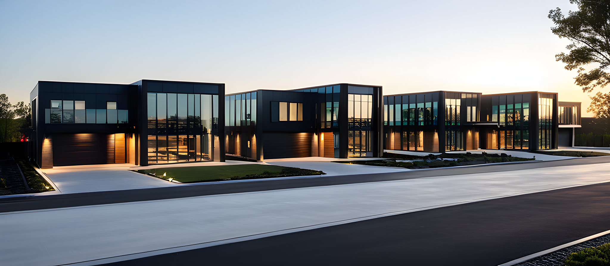PromptMODERN ARCHITECTURE, LAND SCAPE, GLASS WINDOWS, BLACK FACADE MATERIAL, CONCRETE DRIVE WAY, GARAGE DOOR, CARS ON DRIVE WAY