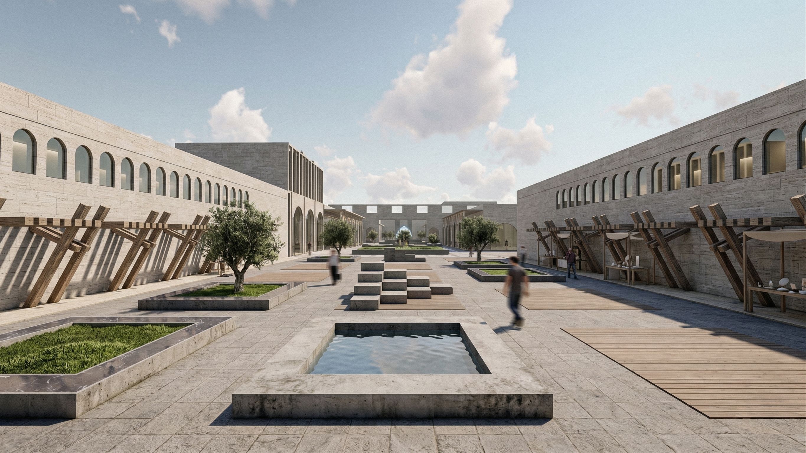 Ultra-realistic architectural render of the provided commercial marketplace design, preserving the exact geometry and layout without any modifications.