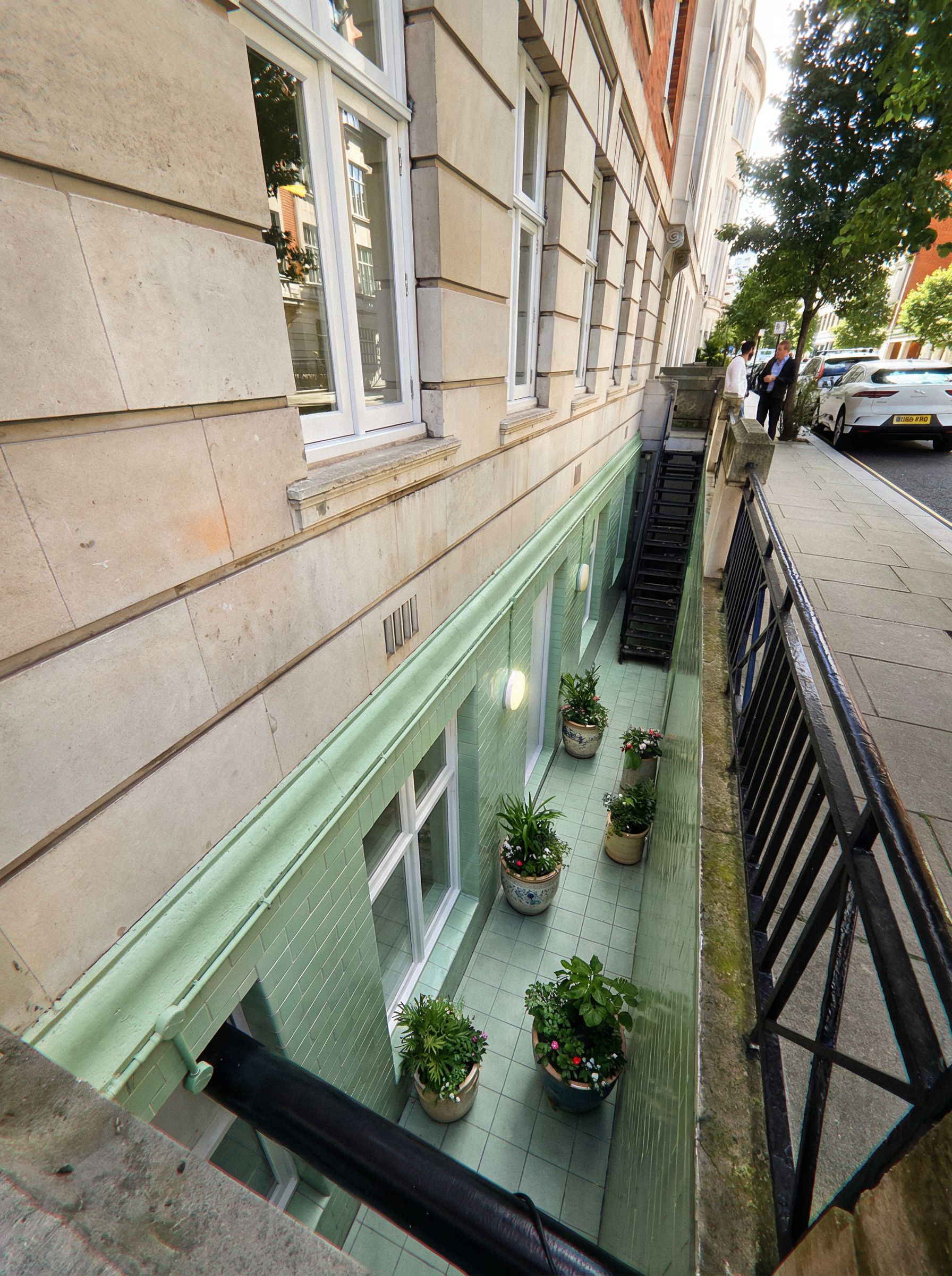 No change to size of lightwell, make lightwell look attractive, with tiled floor light green wall, remove window bars, some planters, keep exact camera angle