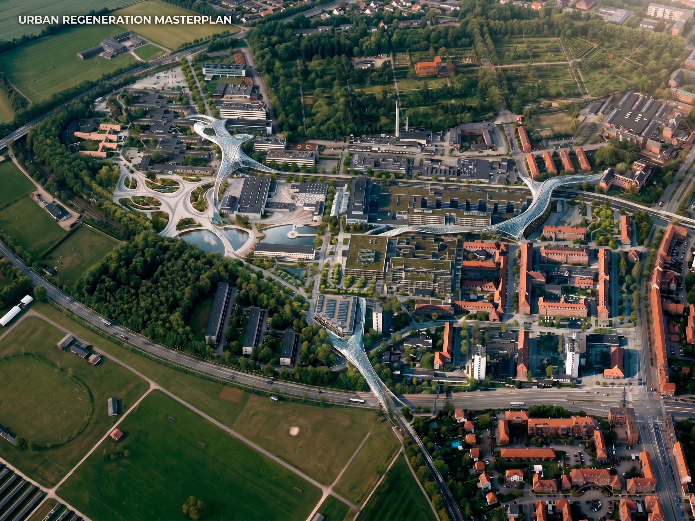 Promptedit this main bird's eye view, with the structures of the reference image1. erase the hand-drawn colored lines., keep exact camera angle
