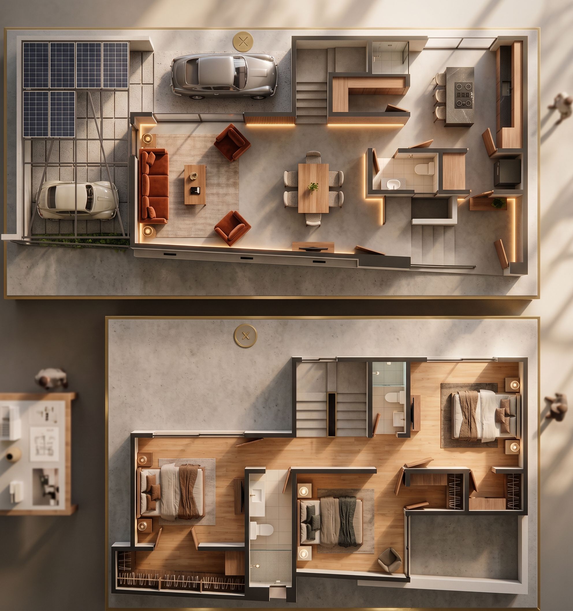 Promptplanos de casa de dos niveles, decoración cálida y moderna, keep exact camera angle