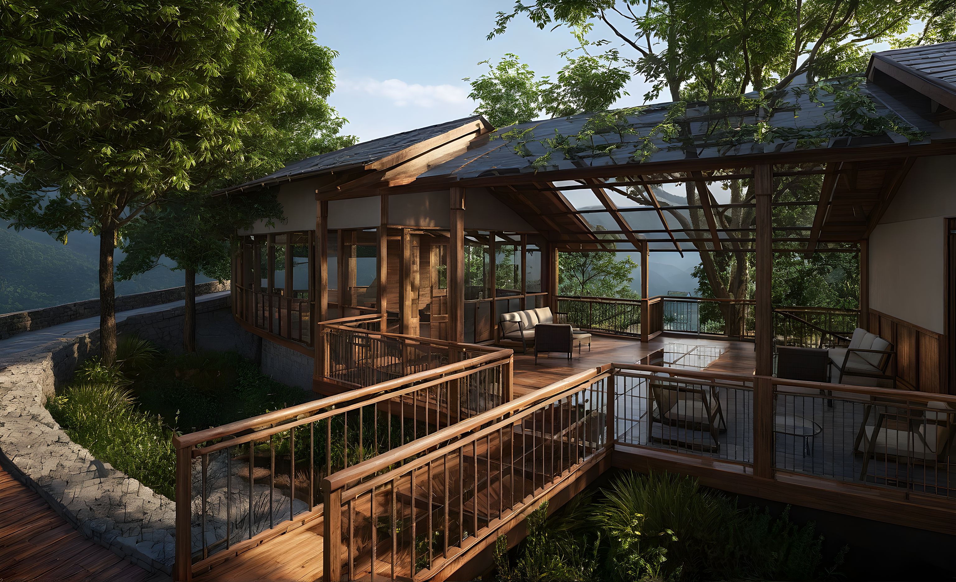 PromptEnhance this semi-open mountain retreat deck in Uttarakhand, India, using precise rendering mode. Retain all original architectural elements — no changes to design or layout. Emphasize handcrafted, non-tiled textures on the wooden railings, flooring, and roof structure. Render the transparent roof panels with realistic reflections, moisture buildup, and soft sky glare, suggesting a cool, dewy morning. Highlight the natural landscape with lush, botanically accurate vegetation, detailed tree bark, and gentle shadowing. Create a peaceful early morning ambiance with diffused sunlight and subtle mist in the distant valley. The scene should feel tranquil, earthy, and immersive — a perfect blend of human craft and natural beauty.
