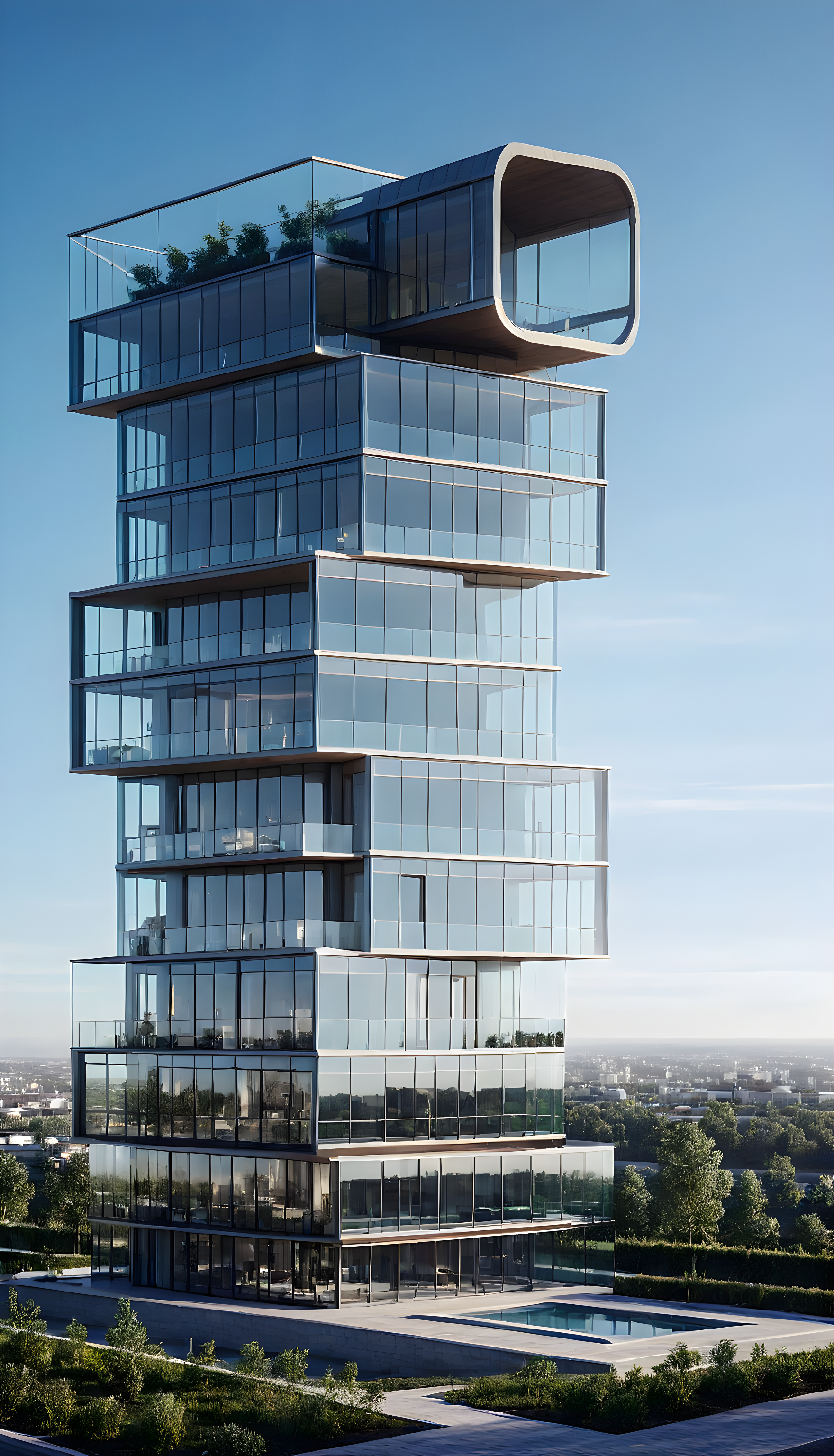 luxury apartments, modern architecture, glass facade, land scape.