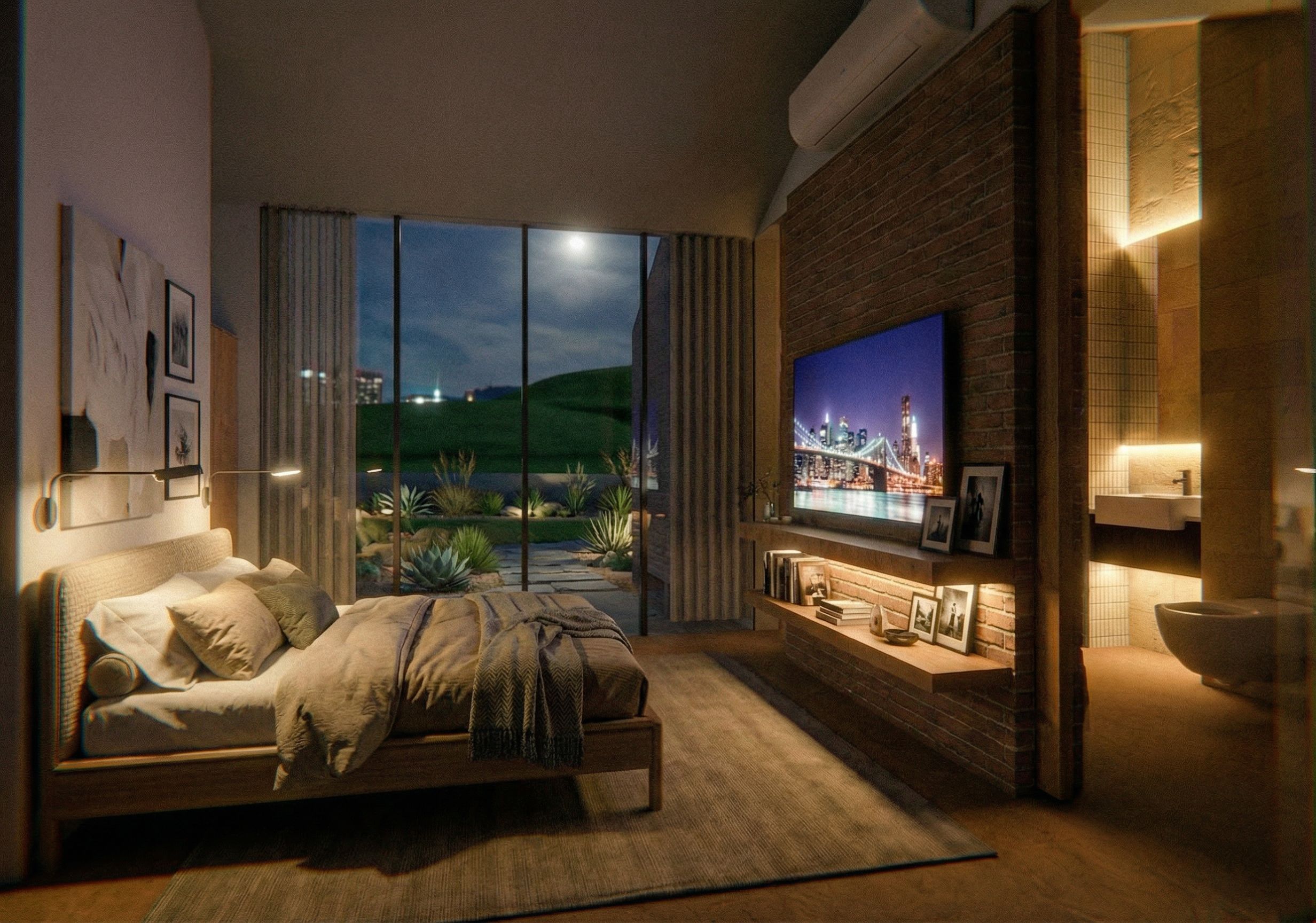 Change the landscape to the outside to semi manicured California style lawn. Add some artwork or photo on he walls to make it look personalized. Remove the Bedside lamp. Add wall mounted reading lights., keep exact camera angle