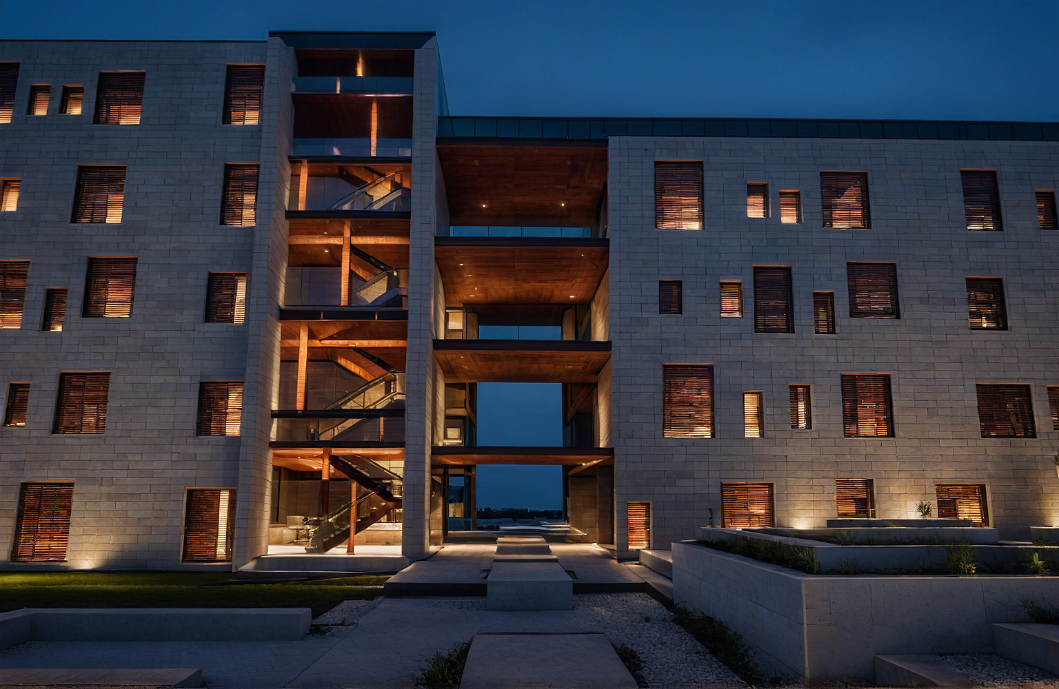 limestone panels with corten steel accents at night