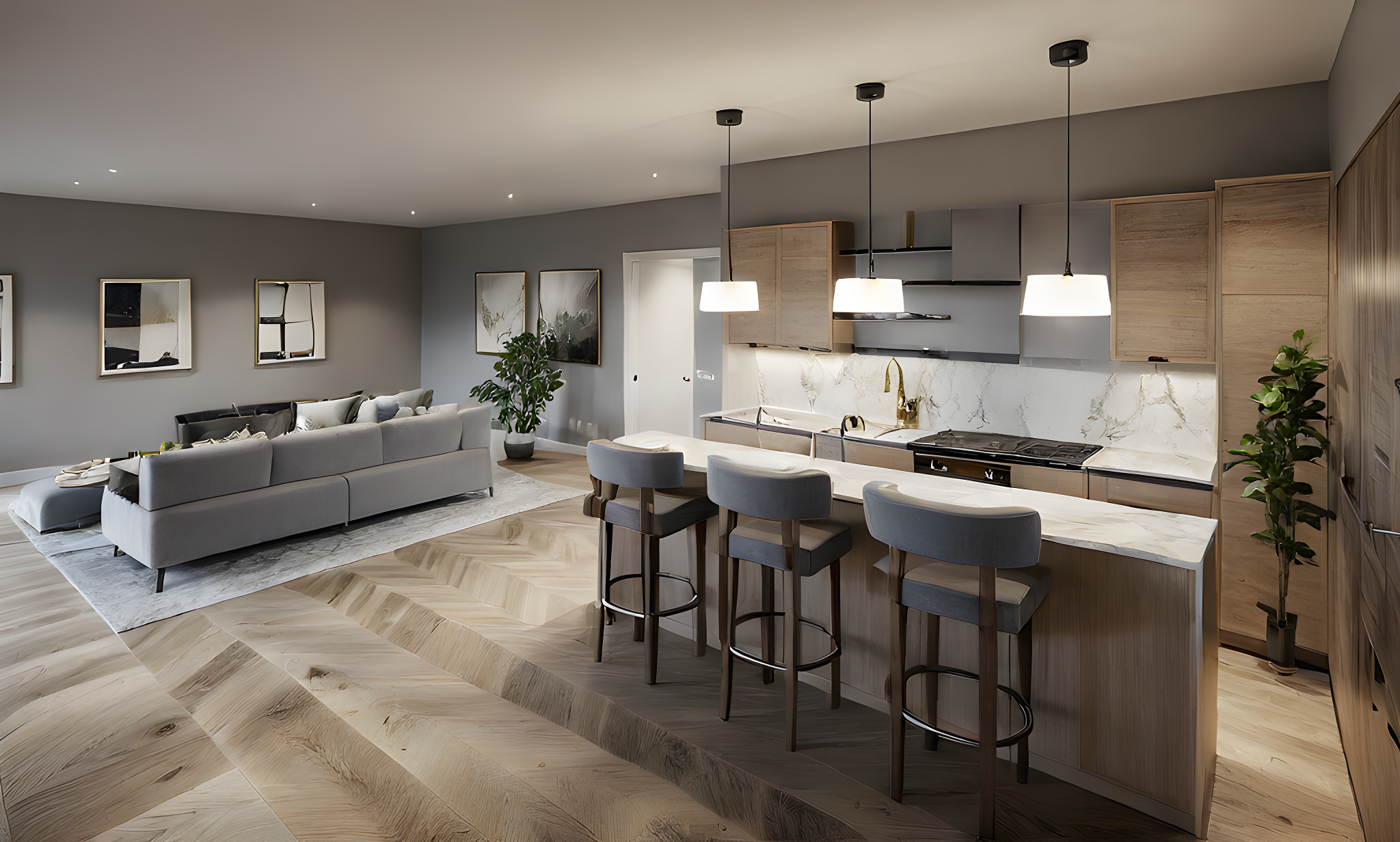 Promptwhite walls, wood floors, scandinavian, grey walls, lighting, modern rug, wood cabinets, marble counter