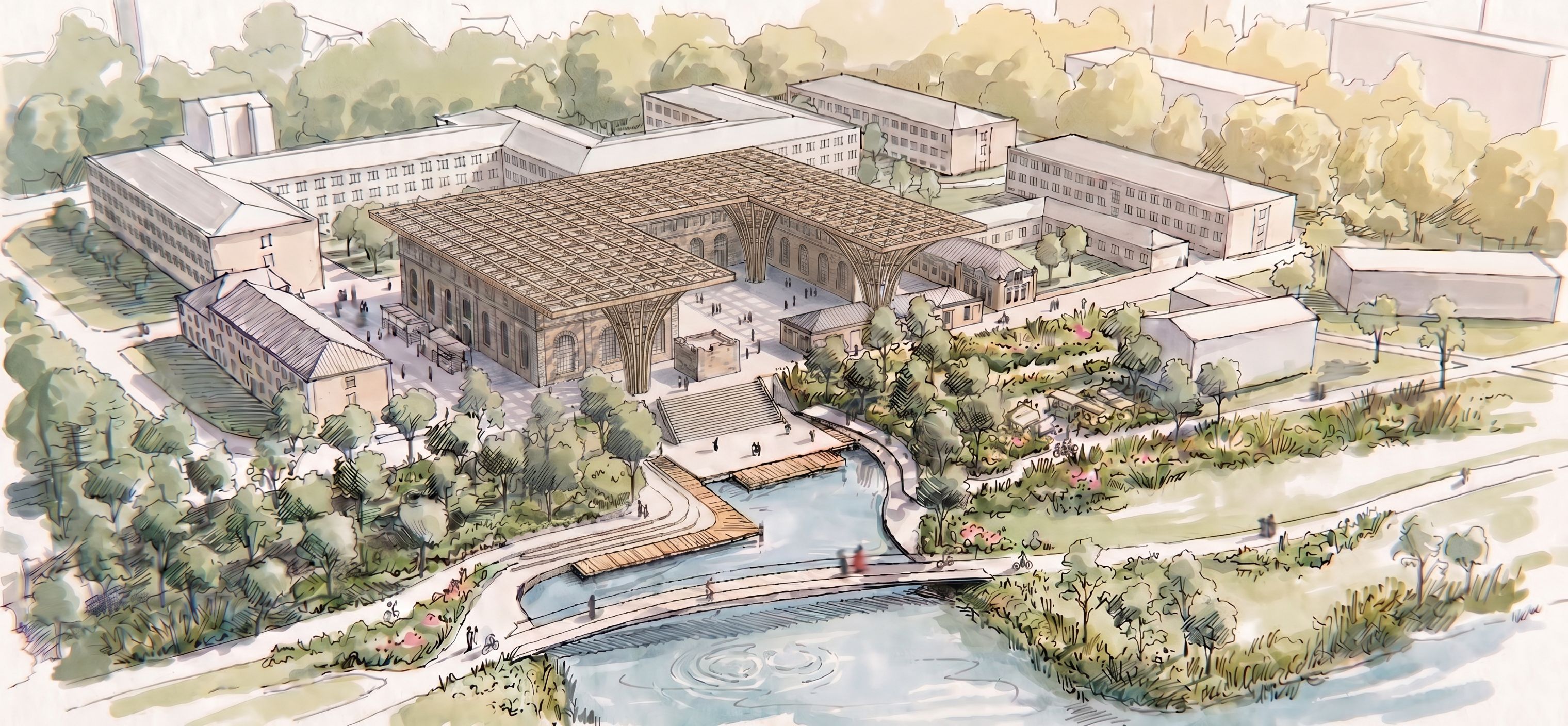 Promptso replace and do the roof as in reference 3d models of this roof and add the colums in the corners like in the model and please make the roof just on the main bulding not any longer on the right side, so it just is on the main bulding not on the park beside....the comuls are only on the left corners of the building and right mot on the small bulding so as the roof make the shape same as in reference floor plan of the roof it shoud be same so make it just like it and ldelete the texts... mainly do as in the 3d model!, keep exact camera angle