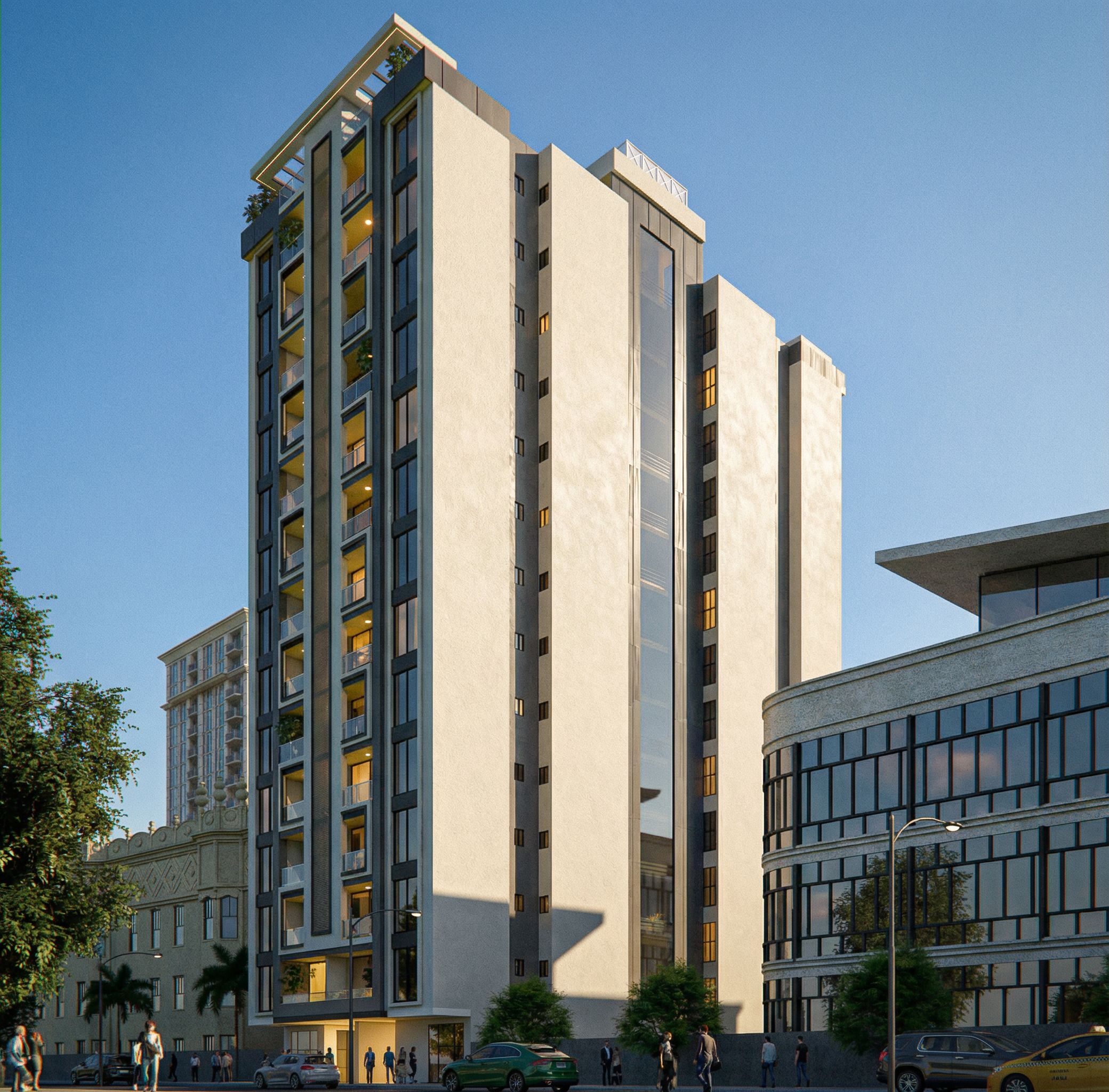 Photo of a modern residential high-rise building, featuring sleek facade elements with glass balconies and integrated greenery. Surrounded by a mix of contemporary and historical architecture, with nearby structures showcasing contrasting styles. The scene is illuminated by soft, natural daylight, accentuating the building's textures and forms. Captured from a low angle to emphasize height and grandeur, using a wide-angle lens to incorporate surrounding urban context. Shadows create dynamic visual interest, enhancing the overall architectural appeal., keep exact camera angle