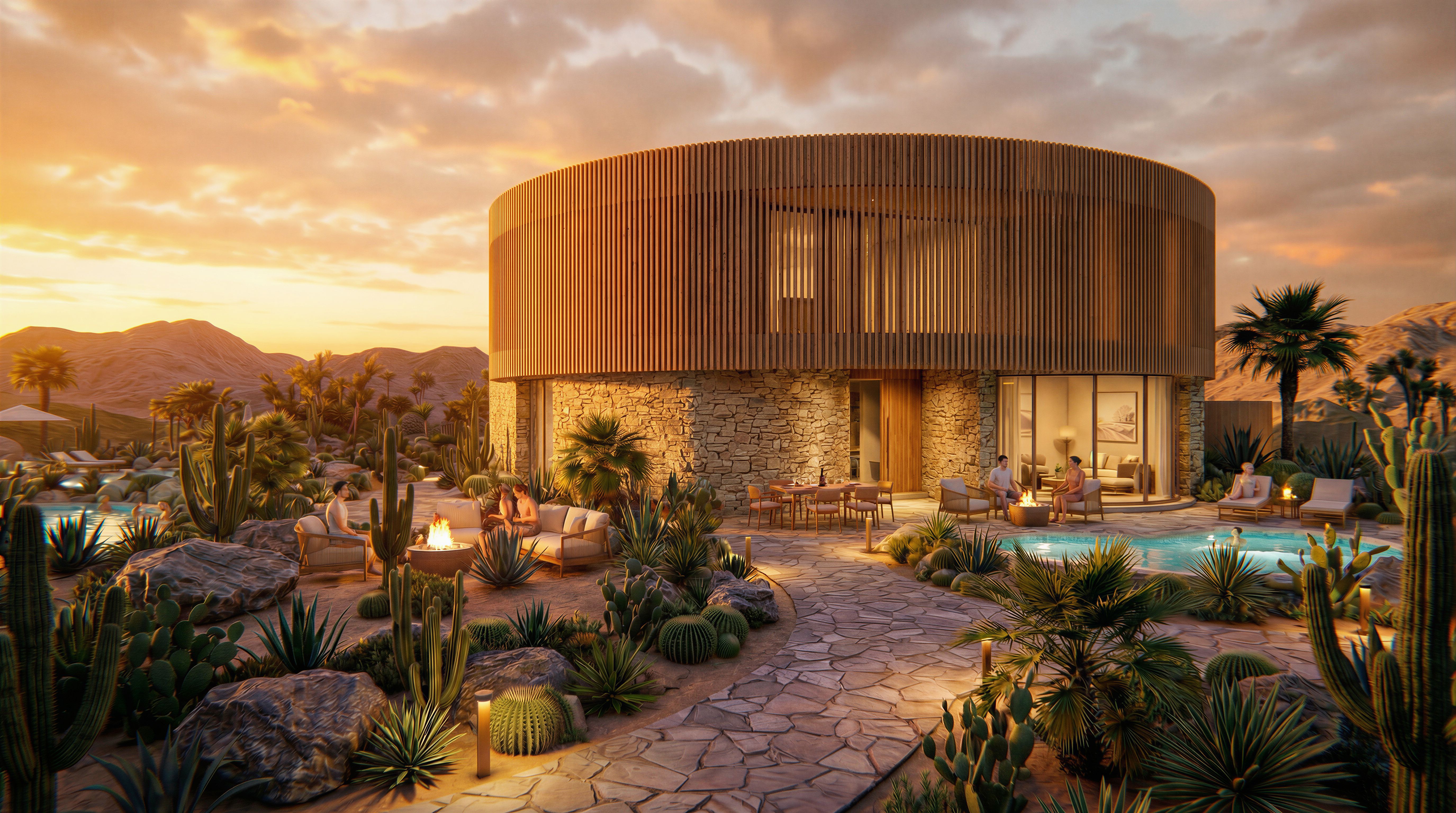 EnhancedPromptChange architecture to be a singular round bungalow 45' in circumference, leaving wood screen detail wrapped around second floor and stone and glass on the first floor, with patios, outdoor modern furniture, fire pits. Place bungalows around pool with modern desert landscaping like in reference 1