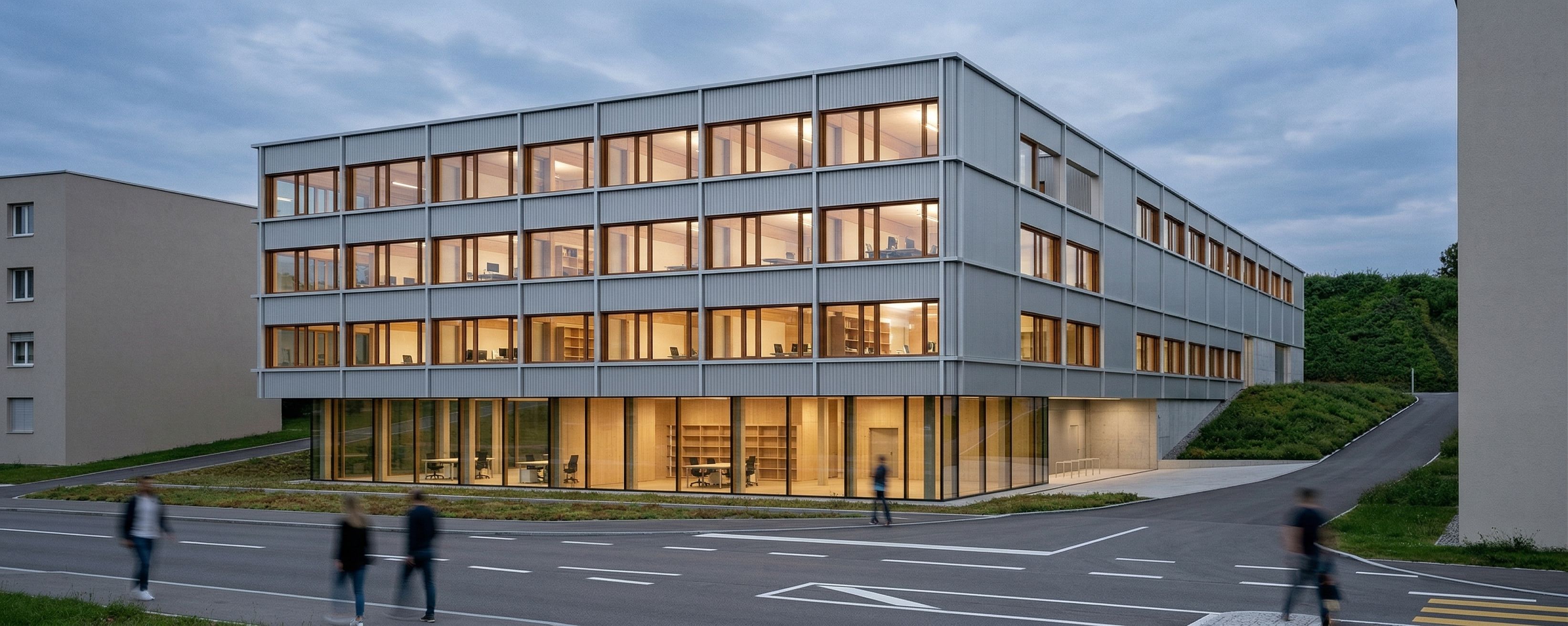 Erstelle eine hochwertige Architekturvisualisierung. Behalte dabei unbedingt die Geometrie und Perspektive aus dem importierten Bild bei Die horizontalen und vertikalen Lisenen sollen aus mattem hellgrauen Metall sein, die zwischenräume mit hellgrauen Trapezblech. Fenster in Holz. der innenbereich soll mit warmen licht nach außen strahlen mit viel holzbau und büro. Achte darauf dass die Freiraumgestaltung sich genau an das importierte Bild hält. die grauen Bereiche sollen Straße werden, die grün dargestellen bereiche sollen mit niedrigem gras bepflanzt werden. Wiese auf der Straße im Vordergrund soll straßenmarkierungen hinzugefügt werden, im hintergrund ist eine begrünte böschung zu sehen.