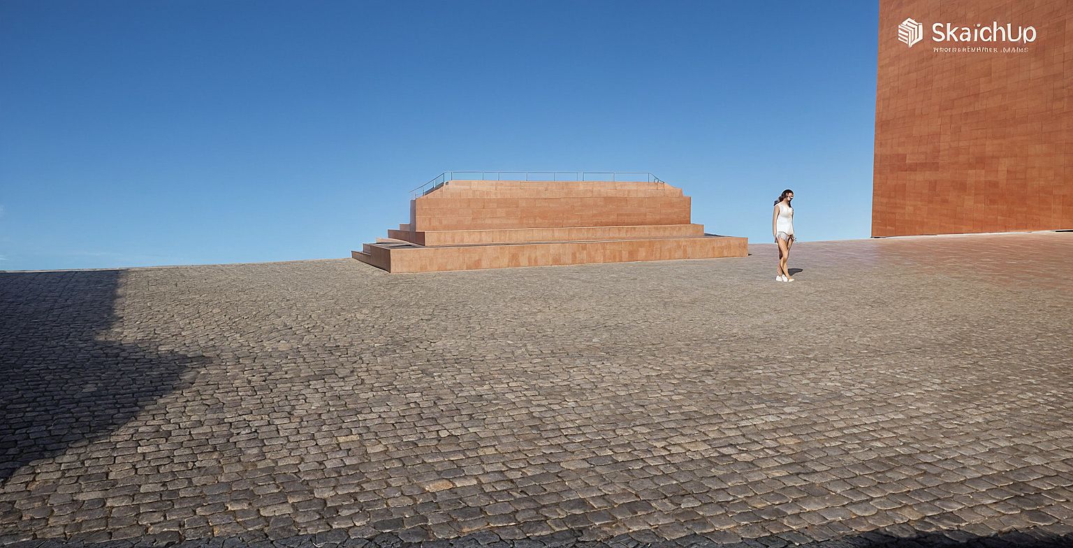 PromptPhoto of a modern architectural platform featuring a raised structure with a textured terracotta facade and a minimalist concrete base. Surrounded by cobblestone paving, the scene includes a figure for scale, enhancing the architectural context. Bright daylight casts soft shadows, illuminating the materials. Captured from a low angle to emphasize the height and depth, using a wide-angle lens to encapsulate the surrounding space and perspective, creating an inviting and striking visual impact.