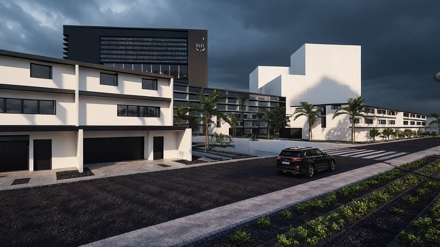 Heavy overcast + raining + dusk sunset + Additional vegetation + Modern building facades + Steel black with glazing finish to all windows + lighting + sky rail color white