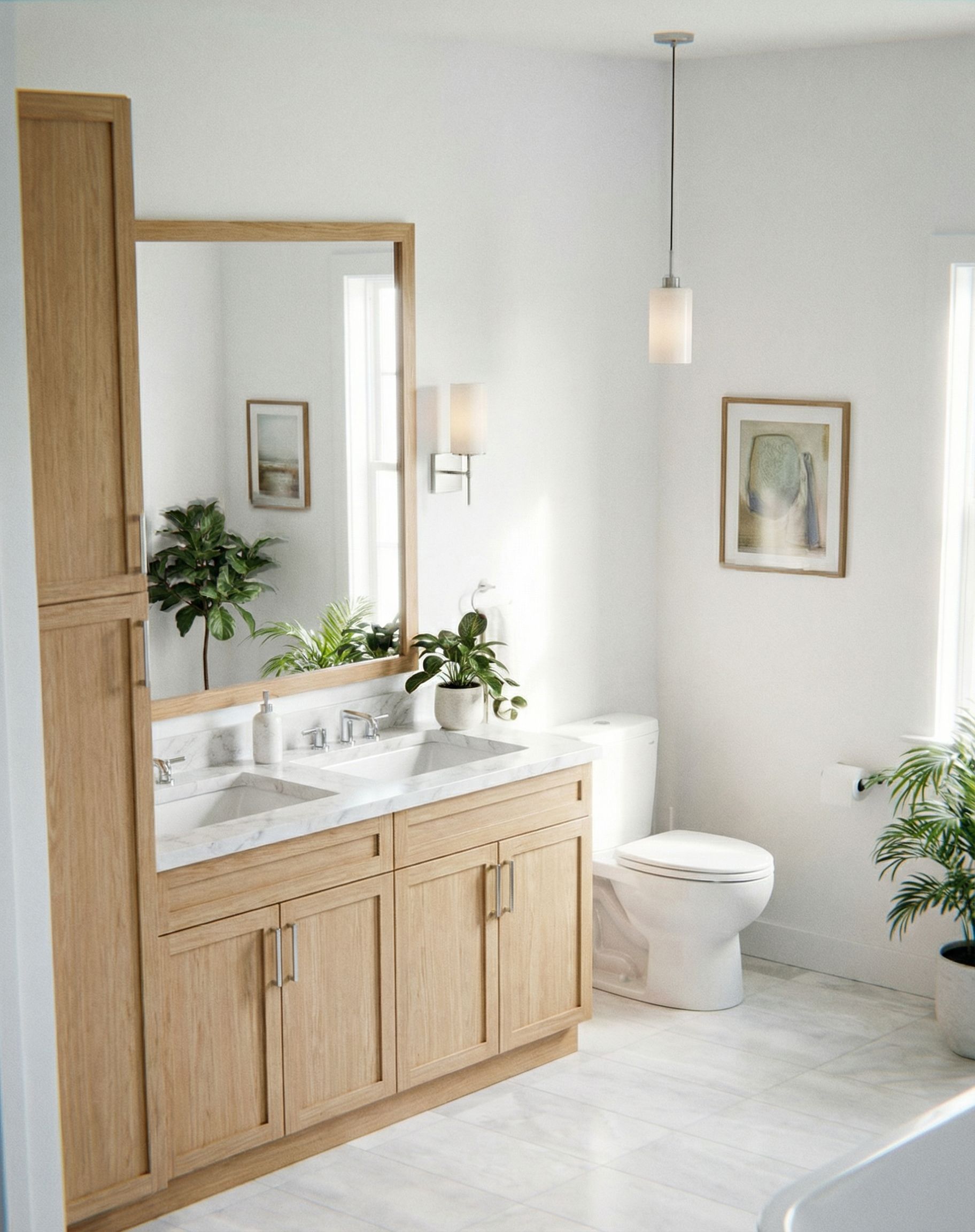 Promptlight Wood tone vanity, marble counters, wood fram mirror, crisp white walls, keep exact camera angle