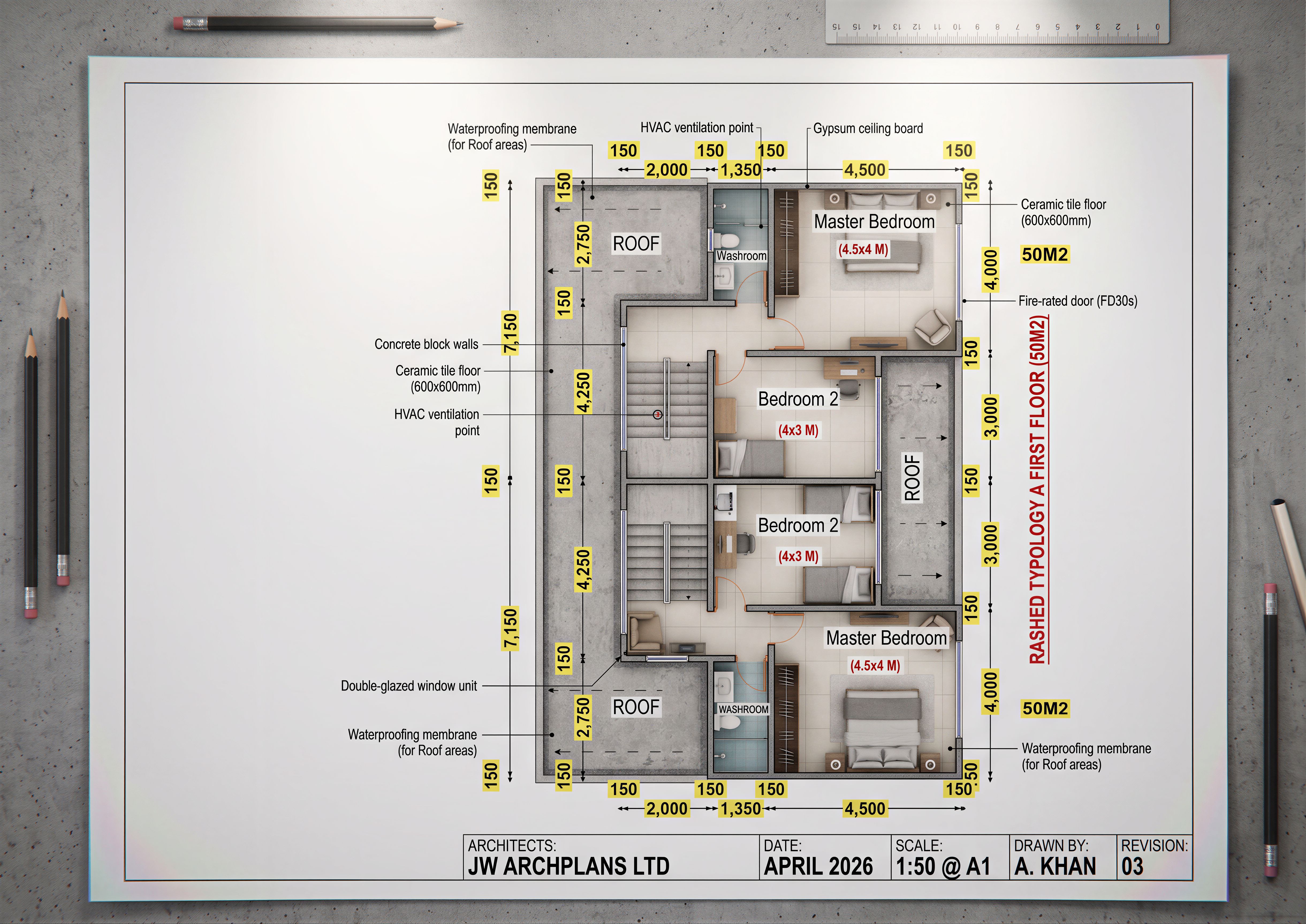 LAYOUT SHOWING THE INTERIOR OF A HOUSE CLEARLY SHOW THE PARTITIONS WITH THE FLOOR FINISHES. USE CERAMIC TILES ON THE FLOORS. CLEARLY INDICATE THE WASHROOMS. MAKE LAYOUT HIGH RESOLUTION OF 8K. ARCHITECTS ON THE TITLE BLOCK SHOULD BE "JW ARCHPLANS LTD" DATE SHOULD BE APRIL 2026, keep exact camera angle