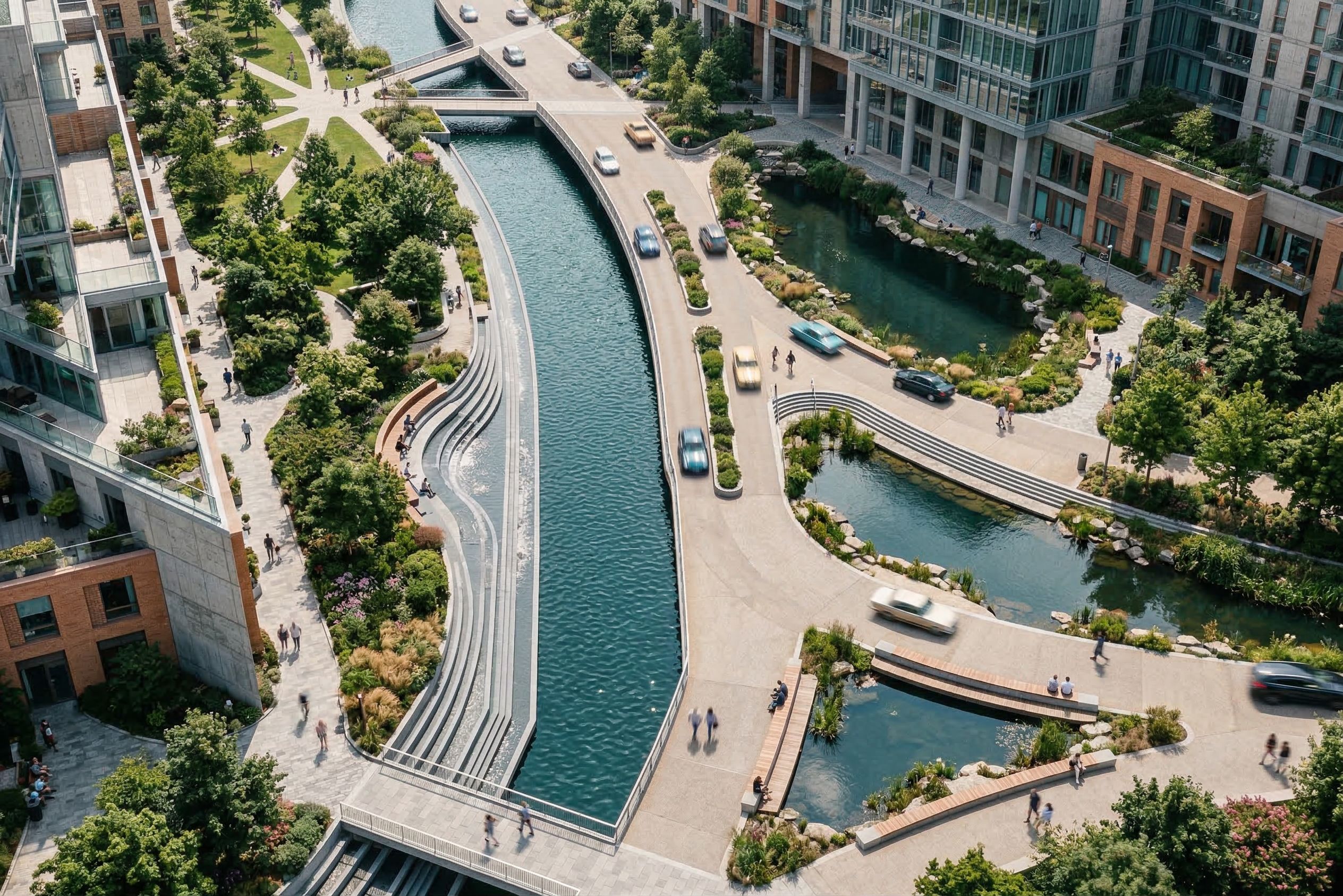 Aerial view of a public outdoor space that is inviting people to sit and enjoy the landscape, it has water, trees, walkways, sitting areas and it feels intentional. The materials used are concrete, glass and terracotta brick for the architecture, the rest should be intentionally landscape. Maintain the geometry, keep exact camera angle