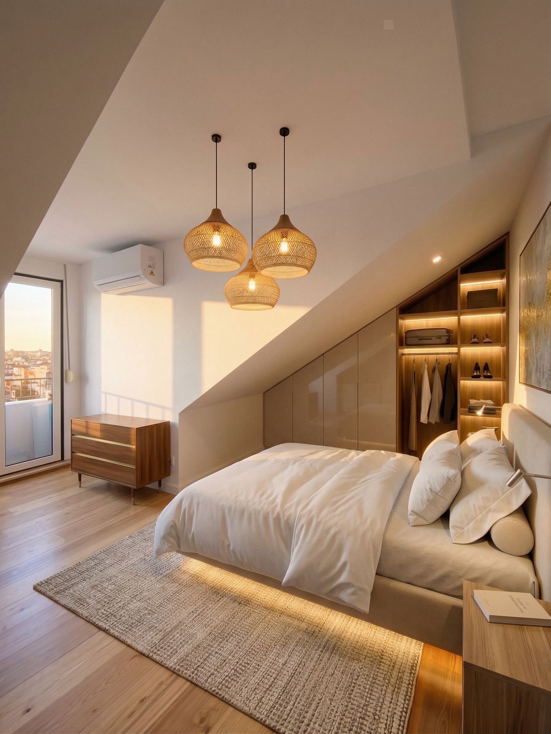Prompt colocar 3 candeeiros suspensos no tecto e retirar os brancos conforme referĂȘncia, retirar jarra de flores da mesa de cabeceira. Colocar a roupra de cama edredon e almofadas em branco. Luzes acesas , keep exact camera angle
