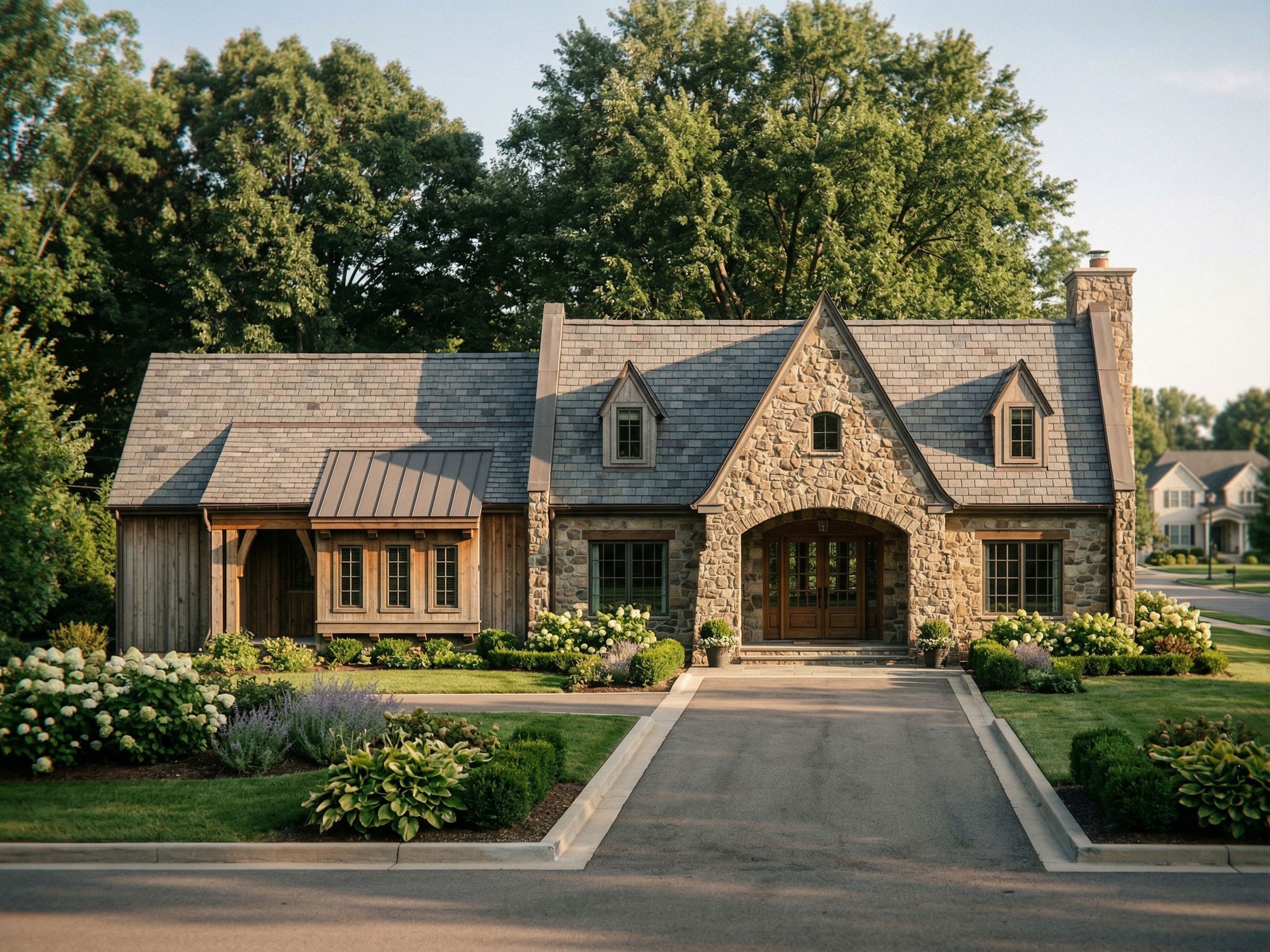 PromptPhoto of a charming stone cottage situated in a manicured suburban neighborhood. Emphasize the textured stone façade, wooden accents, and intricately detailed roof. Surrounding the house are lush green gardens and curbed pathways. The afternoon sunlight casts soft shadows across the structure, highlighting its dimensions and features. Captured from a frontal angle, using a wide-angle lens to include the extensive front yard and pathway leading up to the porch, showcasing symmetry and inviting warmth.