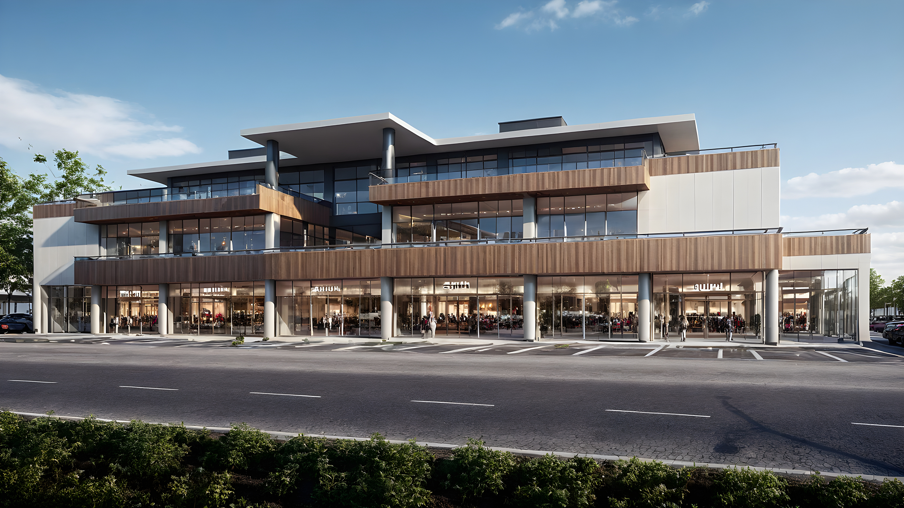 Promptshopping mall, cars, trees, people, realistic rendering, modern facade, realistic sky, parked cars, lighting on the facade, small trees in front of the building, people walking, cars passing by
