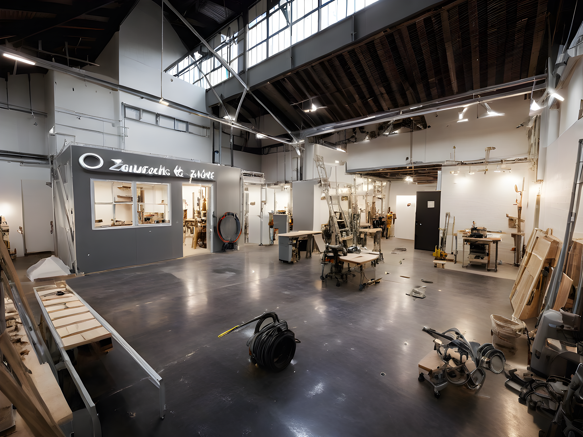 Promptinterior of fabrication space, 5 artists working on sculpture, tools, 1000 square feet, 3 worktables