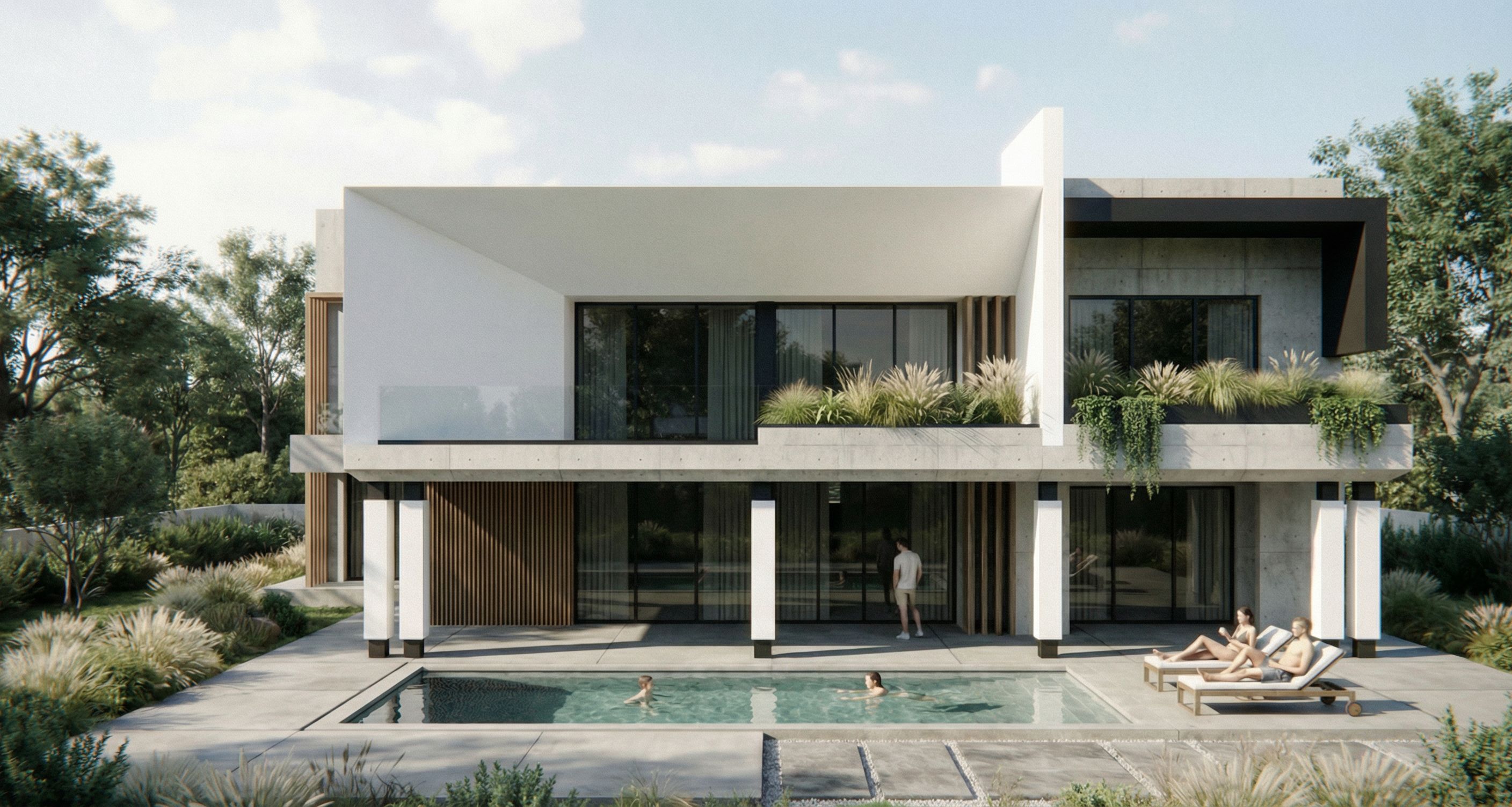 modern minimalist concrete house, rear view of the house, two-story contemporary architecture, exposed concrete facade, large cantilevered roof, floor-to-ceiling slightly tinted dark glass windows with a lighter dark tint, black metal window frames, no curtains, all doors made of glass with black metal frames, transparent glass railings, all structural columns finished with a combination of white and black, dark metal accents and vertical wood slats, modern swimming pool integrated into the backyard, minimalist pool terrace with clean concrete or stone flooring, natural landscaping with ornamental grasses, shrubs and trees surrounding the backyard, areas marked with red boxes should be finished with white paint, areas marked with green boxes should have exposed concrete texture, calm residential environment, daytime architectural render, bright sky with soft clouds, natural daylight illumination, soft natural shadows, no artificial lighting, architectural photography style, ultra realistic materials, global illumination, ray tracing, highly detailed textures, photorealistic architectural visualization, 8k render, strictly preserve the original architecture of the reference image, maintain the same building shape, proportions and structure, keep exact camera angle
