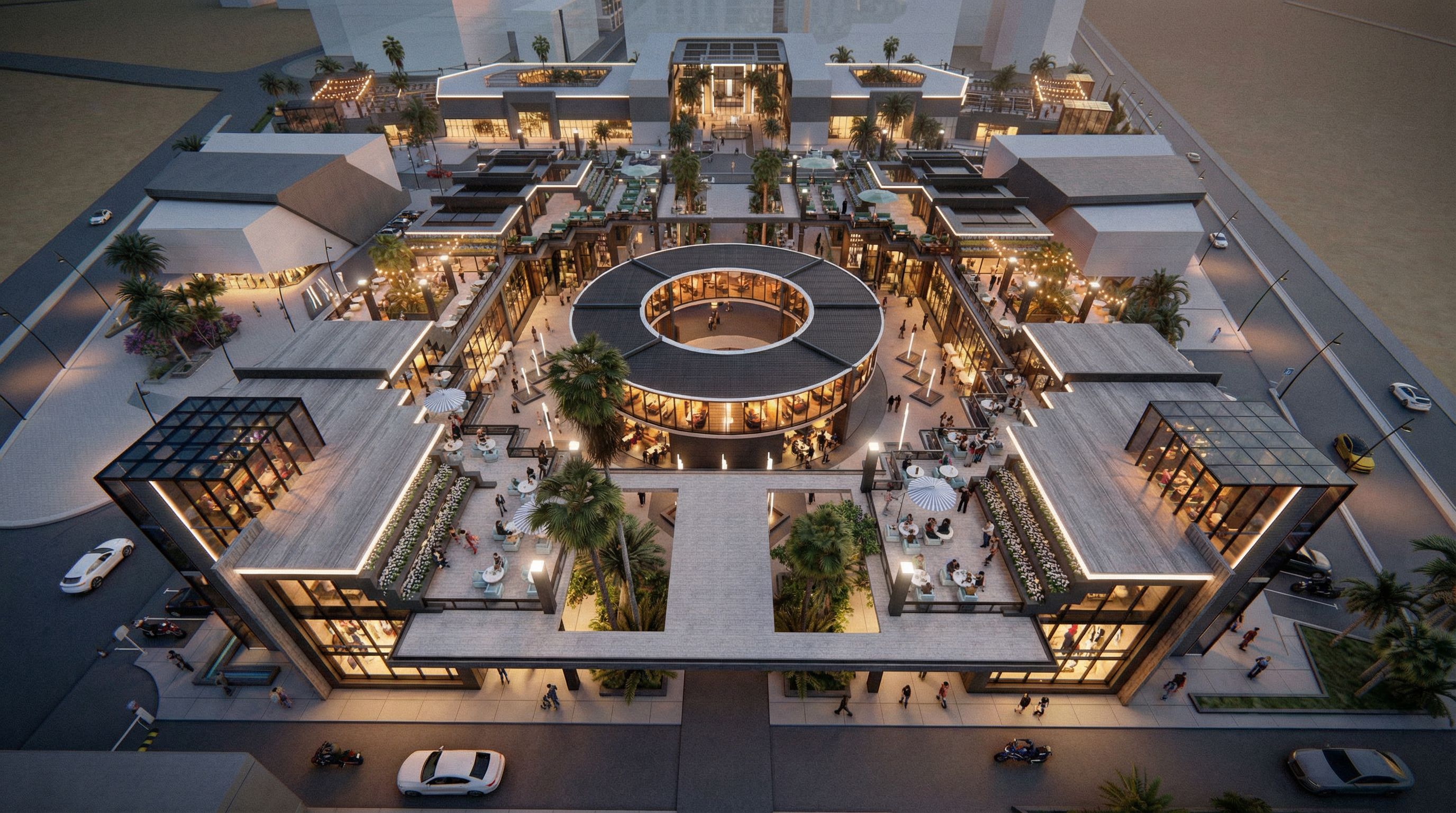 Promptthis is an area of cafeterias and restaurants and shopping center.. the rooftop is terraces for cafeterias and the ground floor is for shopping... make everything look more realistic and the people real.. and the cars as well must look super realistic the round structure in the middle is a restaurant , keep exact camera angle