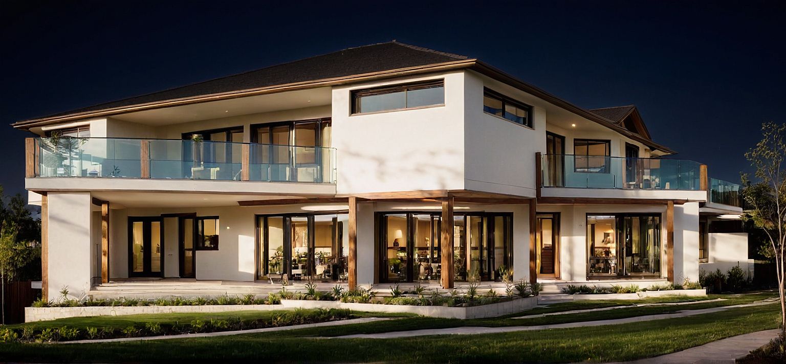 PromptPhoto of a contemporary residential building with expansive balconies with glass decks and large glass windows, showcasing a blend of wood and stucco materials. The structure features a geometric design with multiple levels and ample outdoor space. Surrounded by a suburban landscape with well-manicured lawns and neighboring homes, the scene is illuminated by soft afternoon sunlight casting gentle shadows. Captured from a low angle to emphasize the height and grandeur, using a wide-angle lens to highlight the intricate details and inviting atmosphere of the setting.