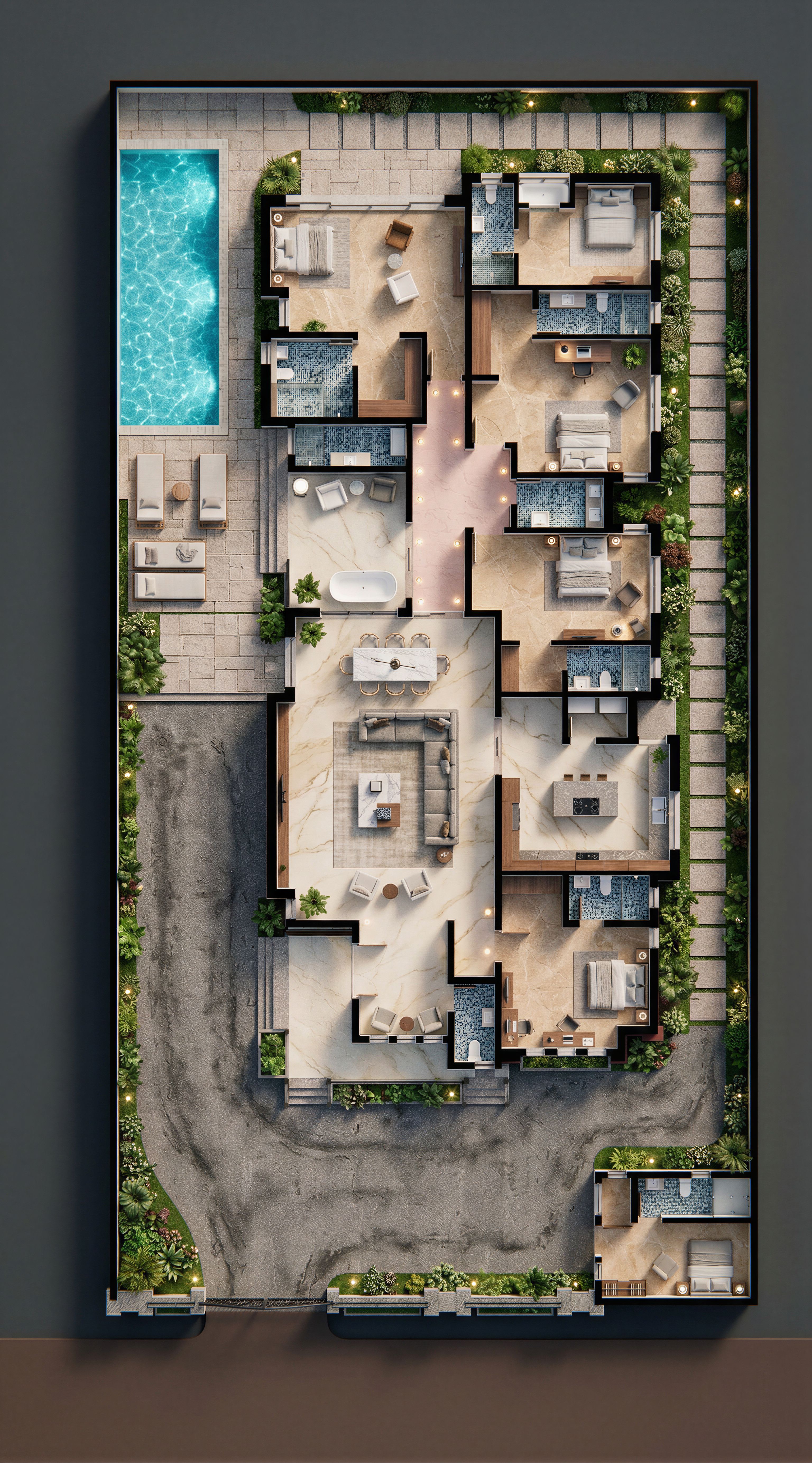 Ultra-realistic floor plan render. Modern apartment layout with open-plan living, dining, and kitchen. Fully furnished interiors with contemporary furniture, realistic bed linens, sofas, dining set, kitchen island and appliances. Warm light stone and marble floor finishes in living and bedrooms, mosaic tiles in the kitchen and restrooms. Clearly defined walls with realistic thickness, black fill color, and clean edges. Natural color palette grey, white, wood tones. Indoor plants and subtle decor elements. Soft ambient lighting with global illumination, high detail textures, realistic materials, professional architectural visualization, photorealistic render, sharp focus, clean background, studio quality, 4K resolution., keep exact camera angle