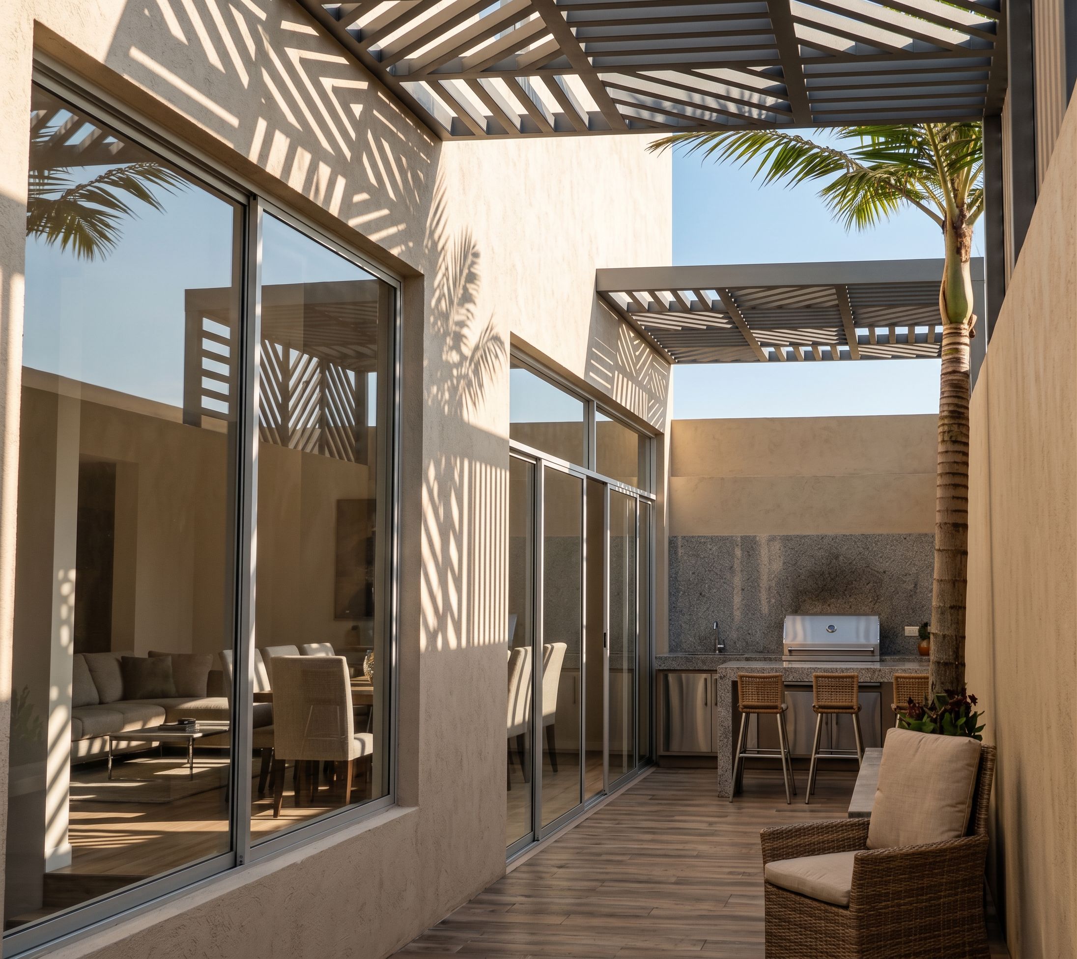 PromptPhoto of a contemporary outdoor living space with large glass sliding doors, wooden flooring, and a woven chair. The architectural design features sleek lines and a dark gray metal structure with a modern roof, enclosed by tall walls around it, light sand-colored, a bar with a gray granite countertop, and in the background a back bar with a grill and a back wall finished with gray granite at medium height. Natural light floods the space, casting soft shadows across the patio. Captured from a low-angle perspective, highlighting the interaction of elements and textures, showing the cozy atmosphere. Wood-look flooring, on the left side in the interior at the back there is a dining area, and on the left side in the interior in the front there is a sunken living room.